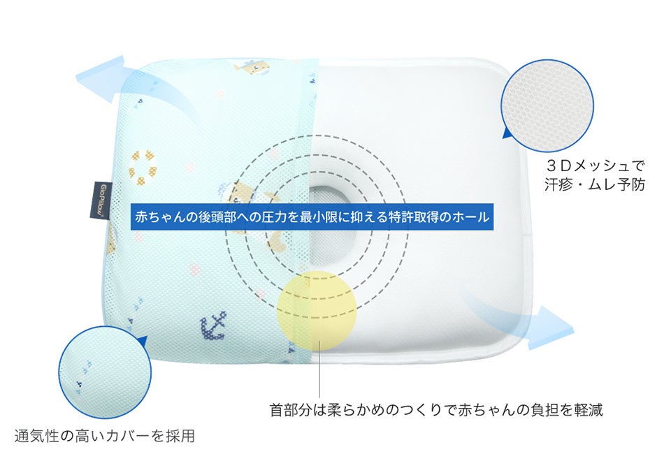 「ジオピロー」は、通気性に優れた3Dエアメッシュ構造を採用しており、赤ちゃんの頭部のムレを防いで心地よい睡眠環境を整え、夏場の熱中症対策にも役立ちます。