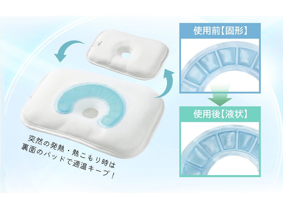 「ジオピロー プレミアム」は、通常の「ジオピロー」の機能に加え、熱を吸収する高機能ジェルパッド付きのリバーシブル仕様で、状況に応じて使い分けが可能です。通常は通気性の高いメッシュ面を、発熱時や気温が高いときには、ひんやりとしたジェル面を使用することで、赤ちゃんの快適な睡眠をサポートします。
