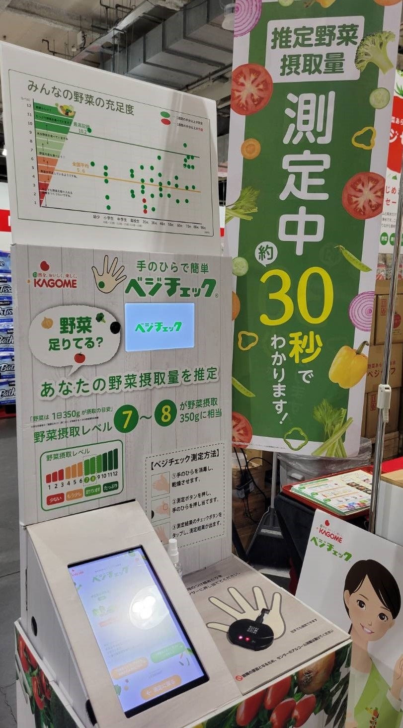手のひらをあてるだけで自分の野菜摂取量が推定できる!カゴメ株式会社が提供する「べジチェック®※」を設置して、来場者さまの野菜摂取レベルを測定いたします。