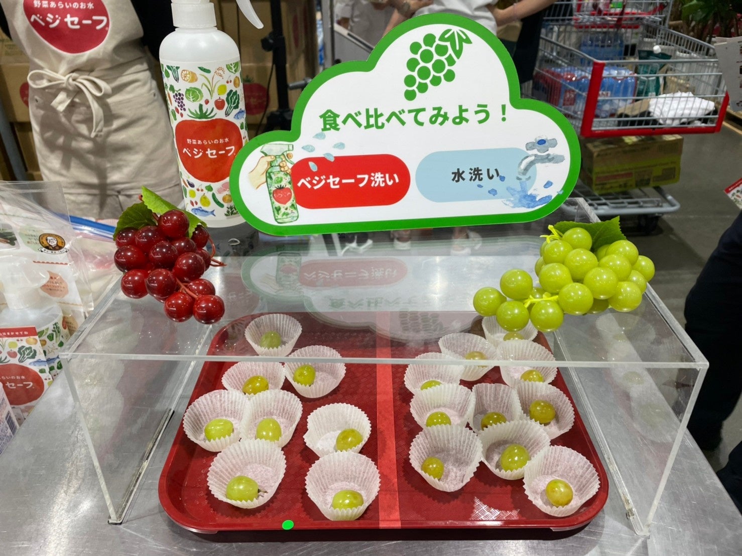 ベジセーフと水道水で洗ったミニトマトとブドウを食べ比べて、食材本来の味を体感いただけます。