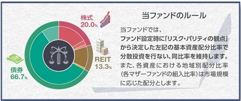 当ファンドは、日興アセットのネット専用低コスト・ノーロードファンドシリーズ「Tracers」の新ファンドです。事前に定めたルールに沿って運用(トレース)する、「Tracers」シリーズの4本目となる当ファンドでは、「ファンドの中でのリスクの大きさ」が概ね均等になるよう配分された比率(株20.0%、REIT13.3%、債券66.7%)を維持するというルールをトレースします。また、当ファンドはTracersシリーズとしては初となる、つみたてNISAの対象商品です。