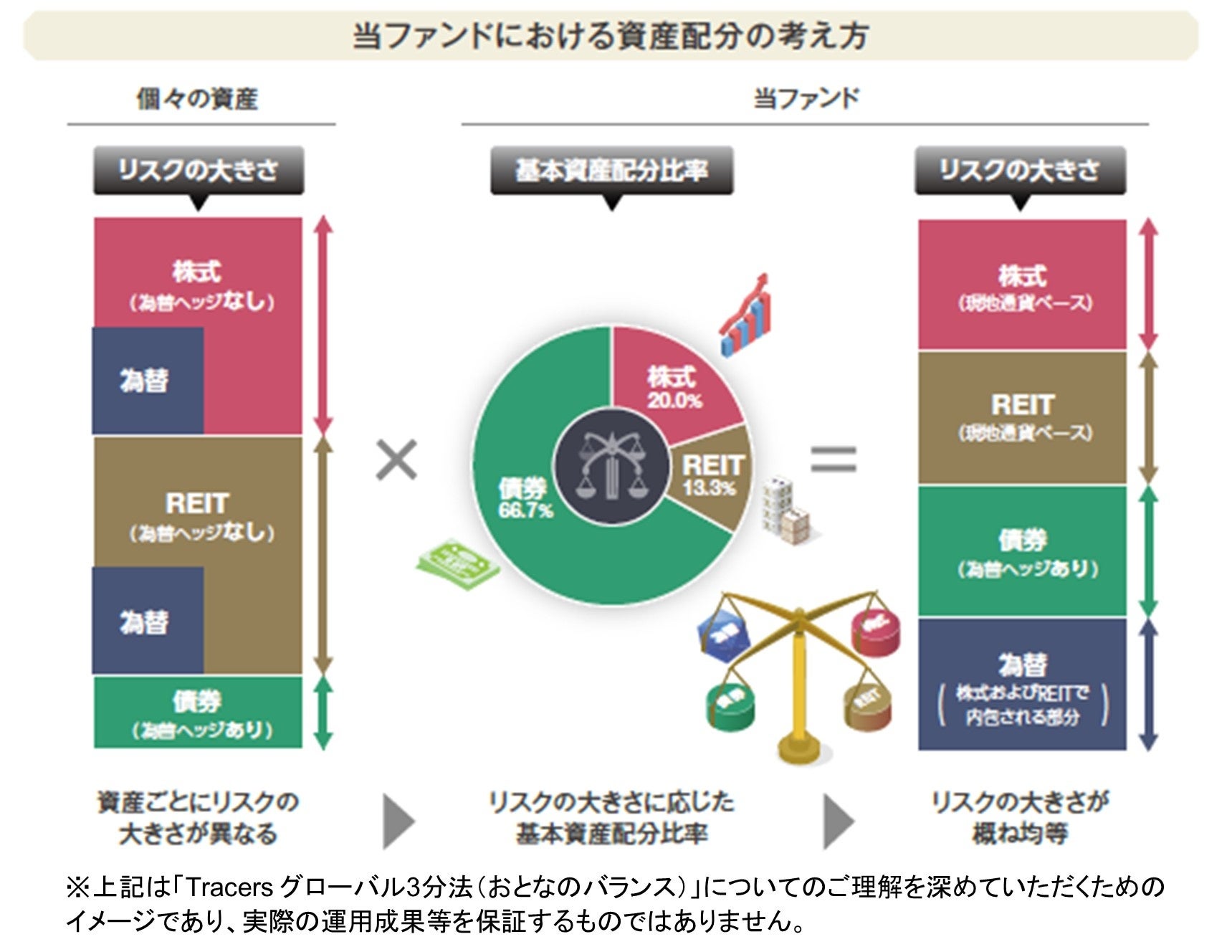 日興アセットマネジメント株式会社(以下、「日興アセット」)は、リスク・パリティ[1] の観点」からファンド設定時に決定した基本資産配分比率で、世界の株式、REIT、債券に分散投資する追加型投信「Tracers グローバル3分法(おとなのバランス)」を2月10日に設定、運用を開始します。株式会社SBI証券、マネックス証券株式会社、楽天証券株式会社が2月10日から、松井証券株式会社が2月27日から、それぞれ取り扱いを開始します。