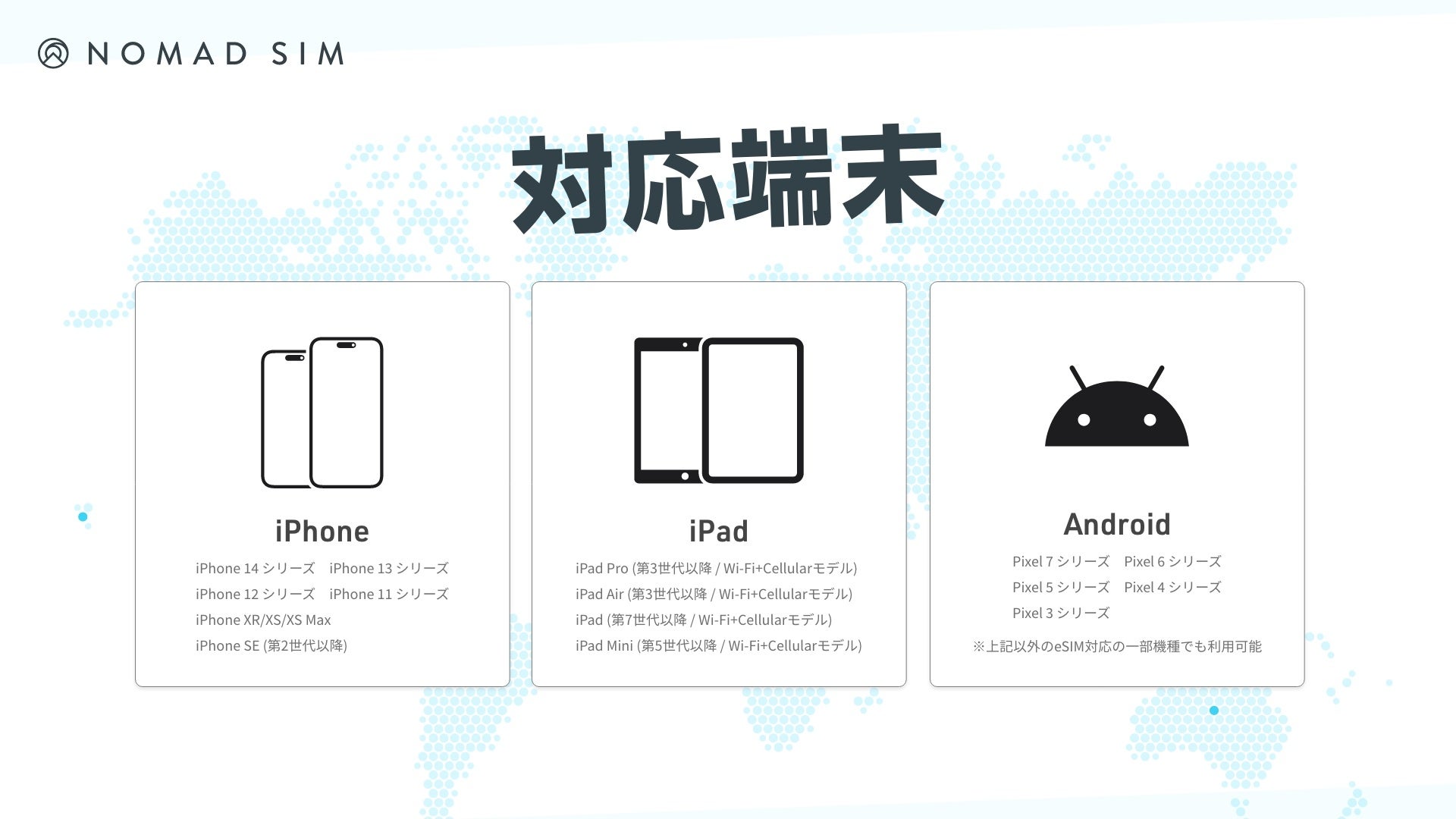 Nomad SIMのeSIMプランを利用できる端末は、eSIM搭載したiPhone/iPad/Androidに対応。