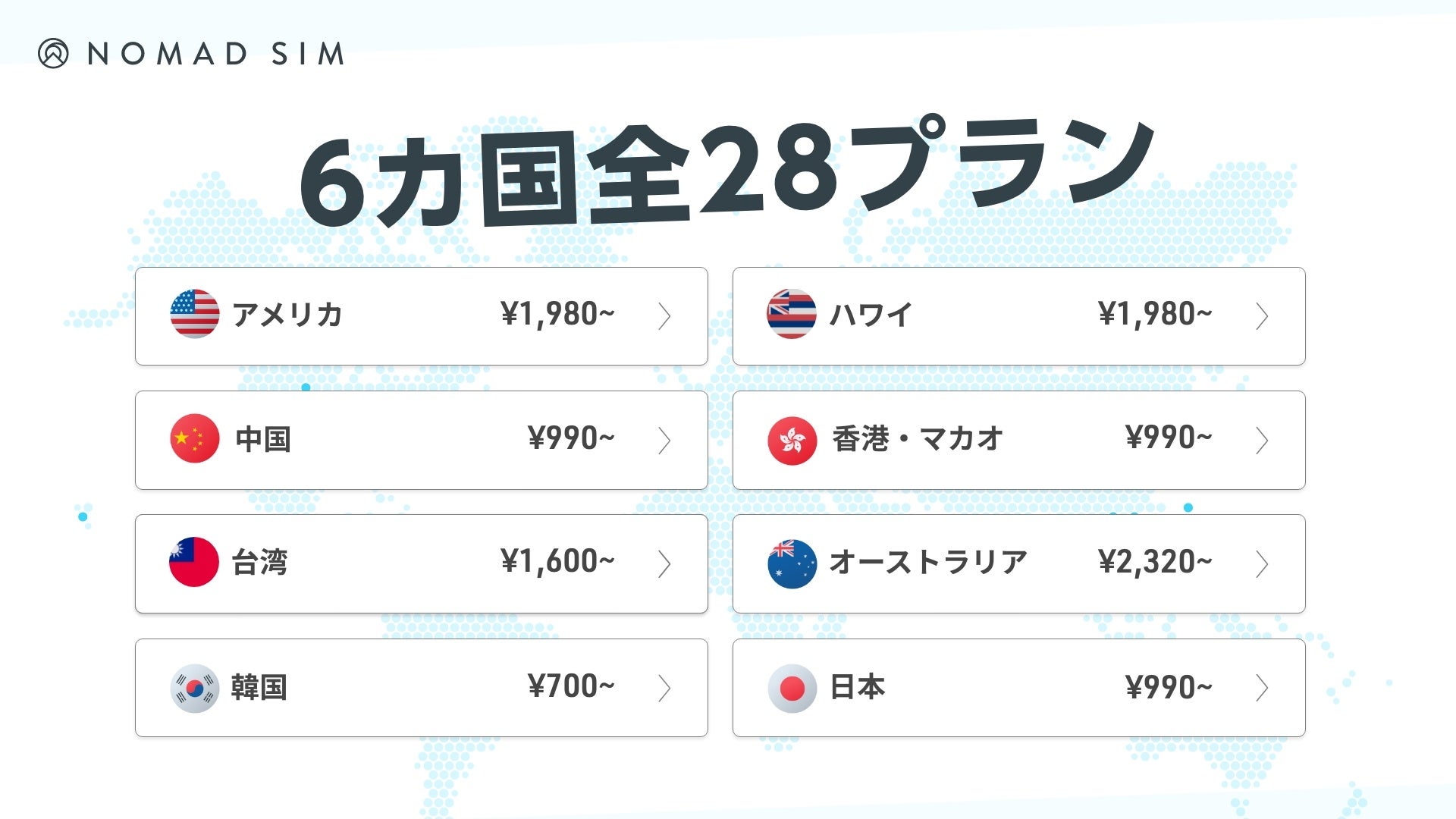株式会社Nomad Works(本社:東京都中央区銀座)は、国内と海外で利用できる新しい「eSIMプラン」を提供しました。対応エリアは日本・アメリカ・ハワイ・中国・香港・マカオ・台湾・韓国・オーストラリアの全6ヶ国28プラン。会員登録不要で、購入したその日から使い始められます。