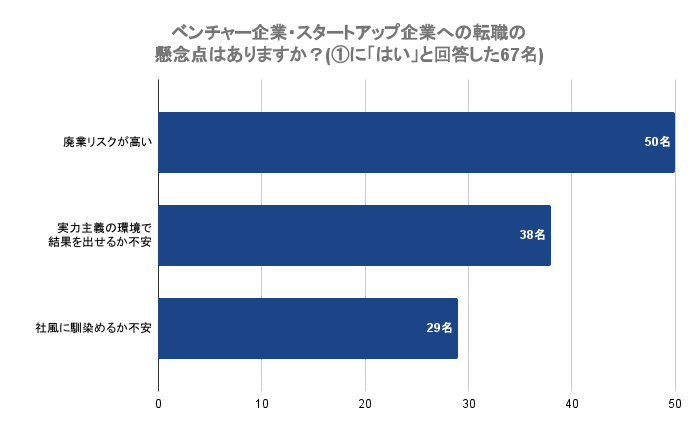 今回の調査から、ベンチャー・スタートアップ企業への転職に興味がある方は全体の20%以上いることが分かりました。一方で、興味がある方のうち、70%の方が「廃業リスクが高い」と懸念を抱えていることが分かりました。この回答から考えると、興味があっても、実際に転職に踏み切れる人は限られてくるのではないかと考えられます。