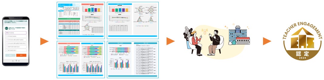 教職員による1回約5分のオンラインアンケートを基に、学校組織の「教師エンゲージメント」及び「職場環境」の特徴・傾向を分析した診断レポートを提供します