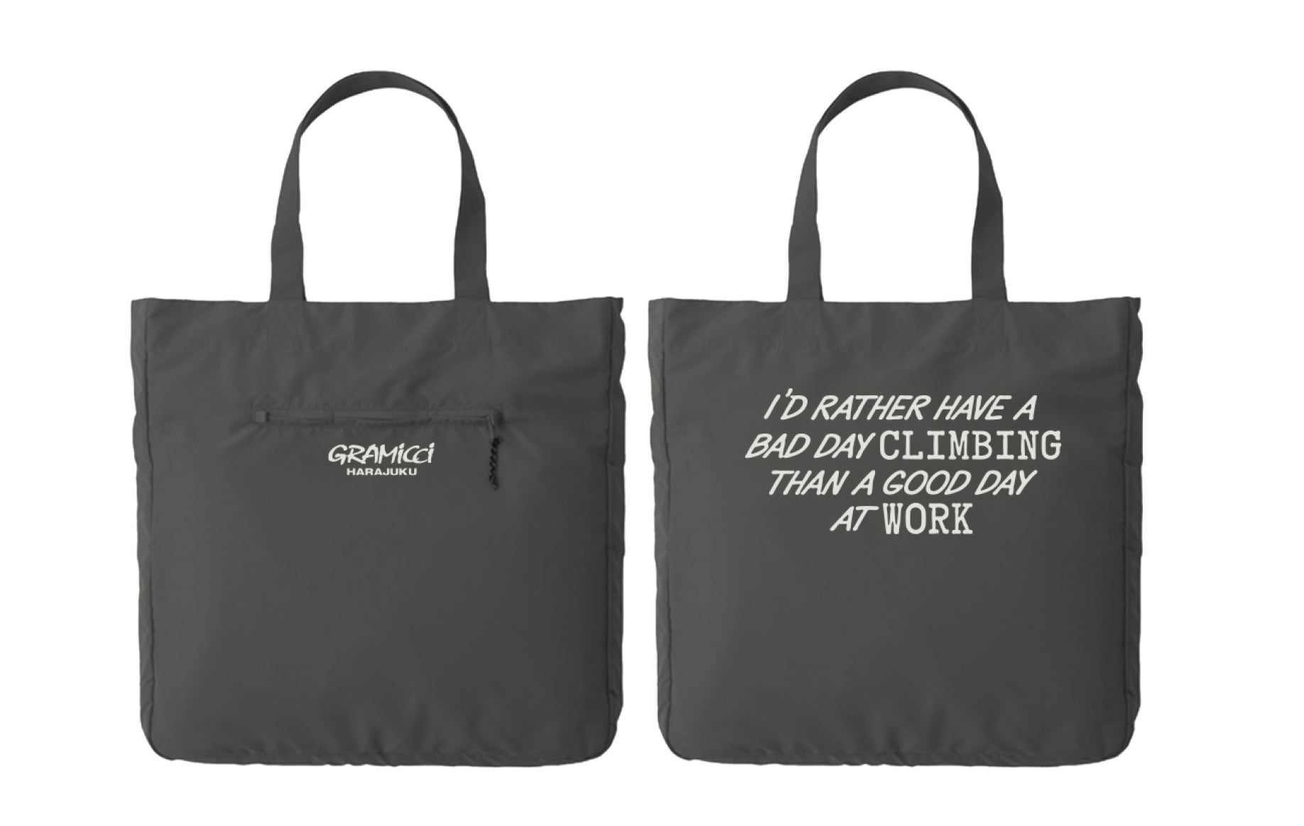 『Gramicci Harajuku』で税込10,000円以上お買い上げいただいた方には、リップストップ生地で作ったシェルトートを数量限定で配布します。片面にはブランドロゴとジップポケット、もう片面にはメッセージ「I'D RATHER HAVE A BAD DAY CLIMBING THAN A GOOD DAY AT WORK.(仕事で良い日を過ごすより、クライミングで悪い日を過ごすほうがいい。)」がデザインされています。