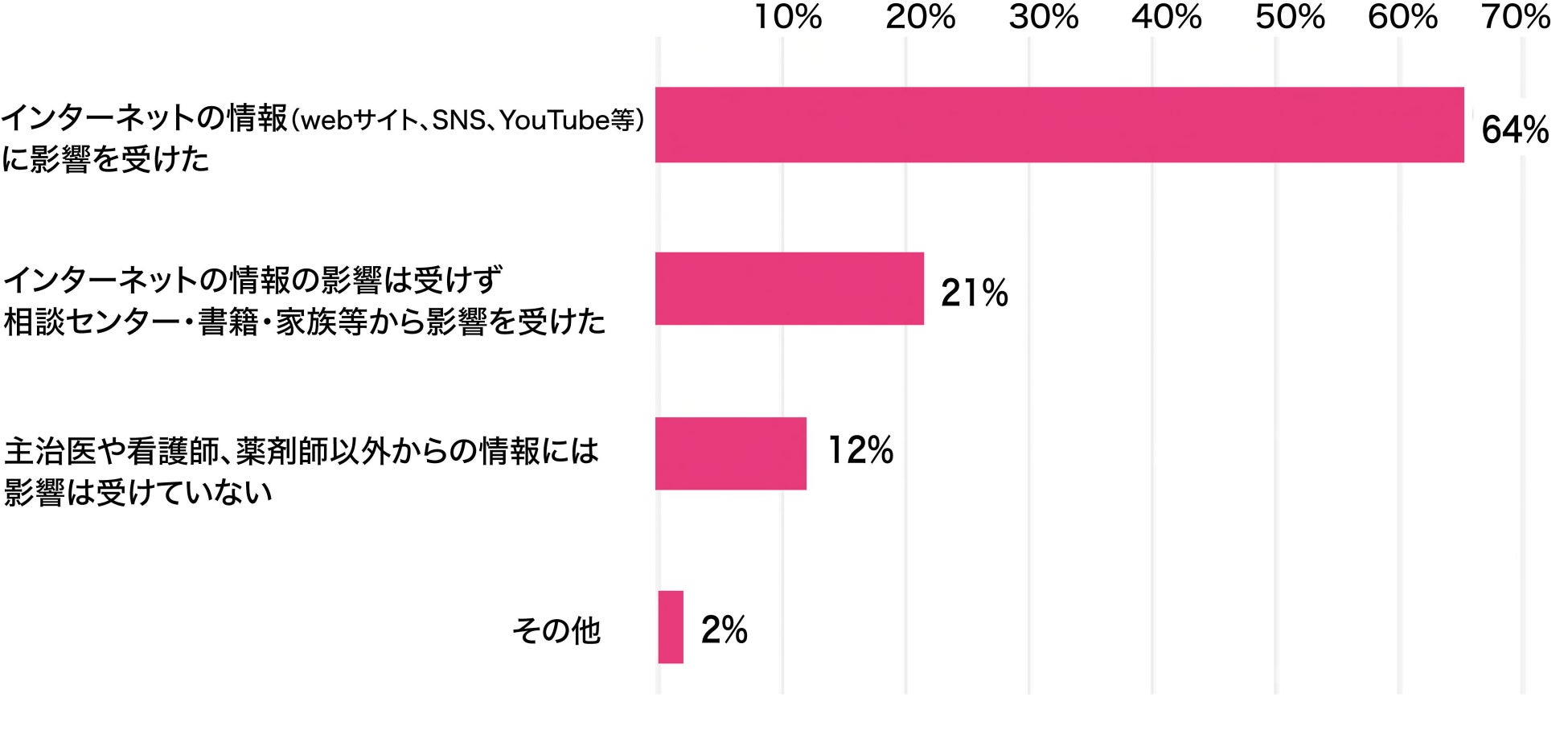 (1)「医師など医療者からの情報以外で影響を受けたのは、SNSやインターネットサイトからの情報」と答えた層が64%