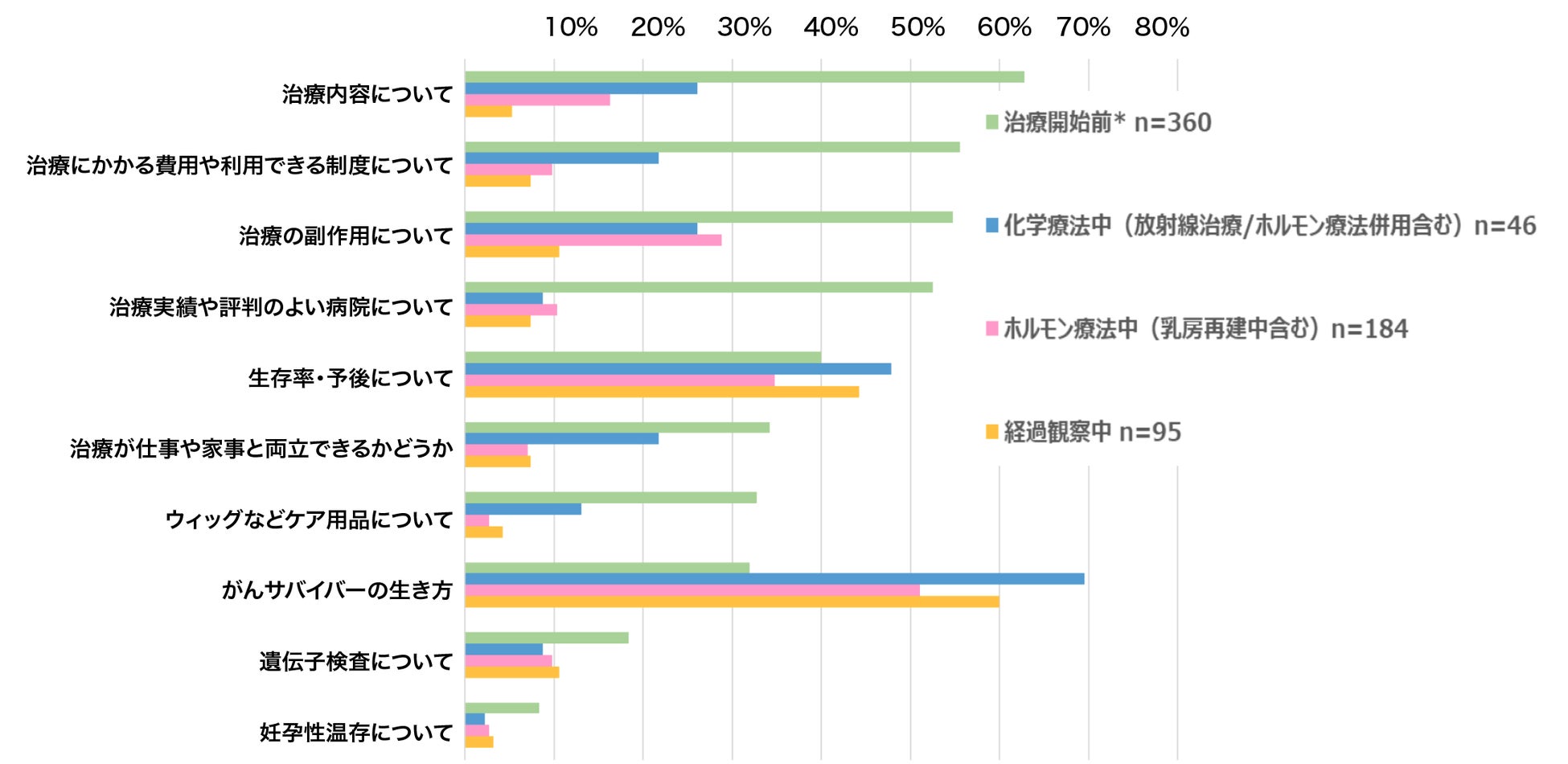 治療開始前は、「治療内容や治療の副作用、治療費用や利用できる制度」など、実質的に治療に関わる情報へのニーズが 高いが、化学療法に入ると、それらのテーマに加え、「サバイバーの生き方」という、その後の人生での行動変容をもたらし得るテー マへの関心が高まる。この傾向は、ホルモン療法、経過観察へと段階が移っても続く。