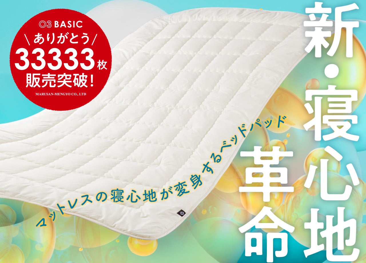 【33,333枚販売突破!】日本の新しい睡眠文化を盛り上げる03BASIC 洗えるベッドパッド!ラッキーナンバー「3」づくしの丸三綿業キャンペーン!3月3日から開始。