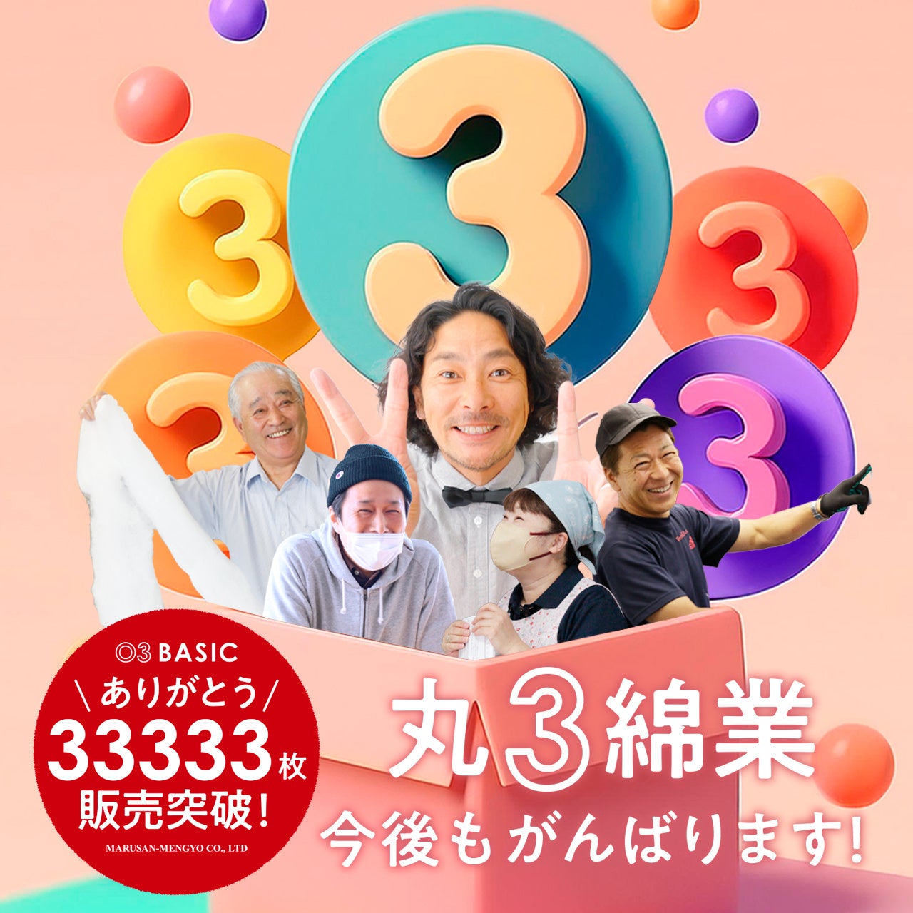 なぜ30,000枚や22,222枚ではお祝いせず、販売枚数33,333枚突破のタイミングでキャンペーンを行うのか?それは会社名でもある丸「三」綿業にもある通り、私たちは「3」が大好きだからです。