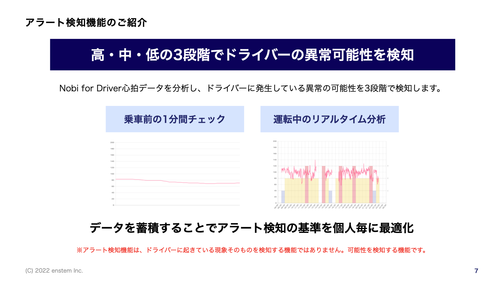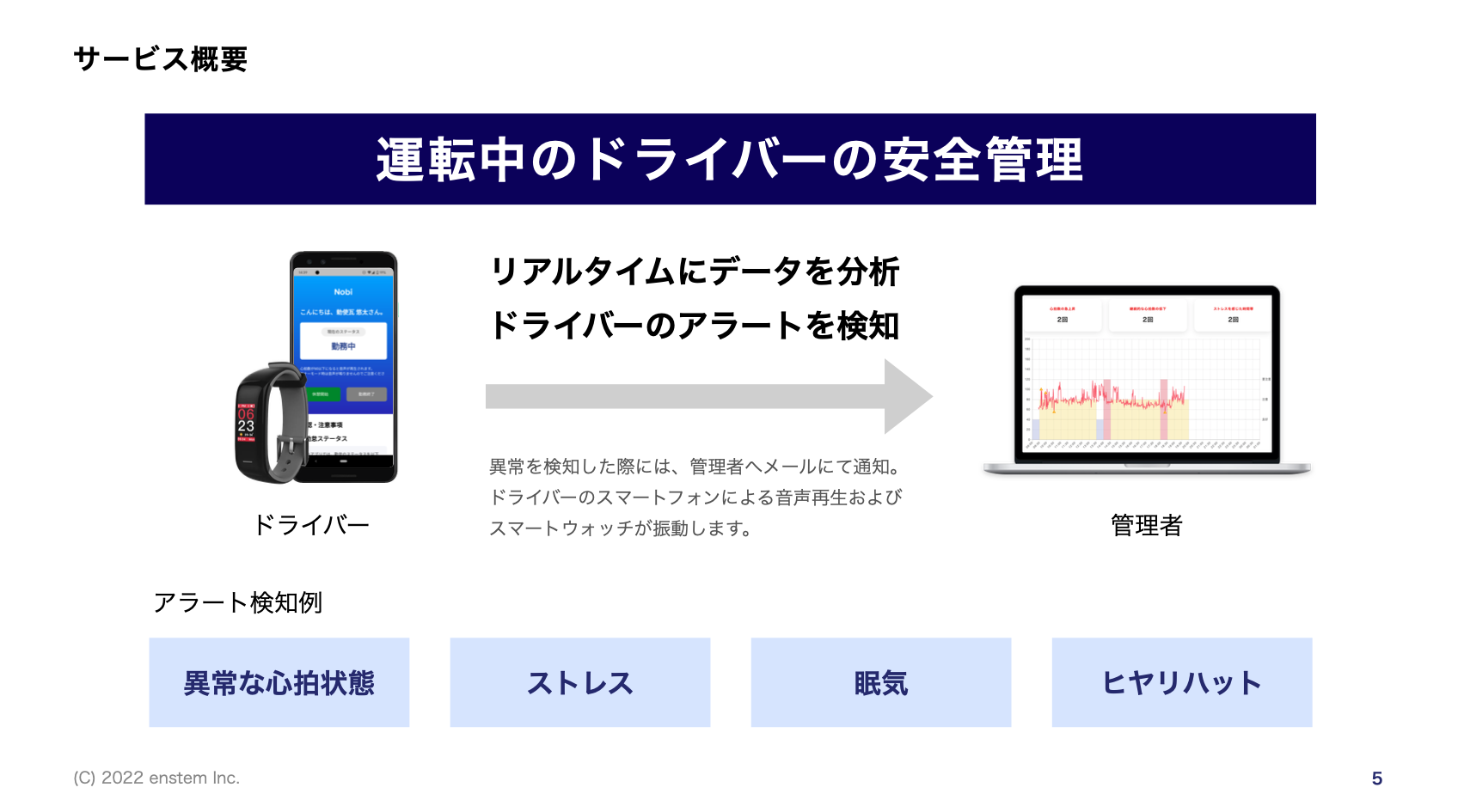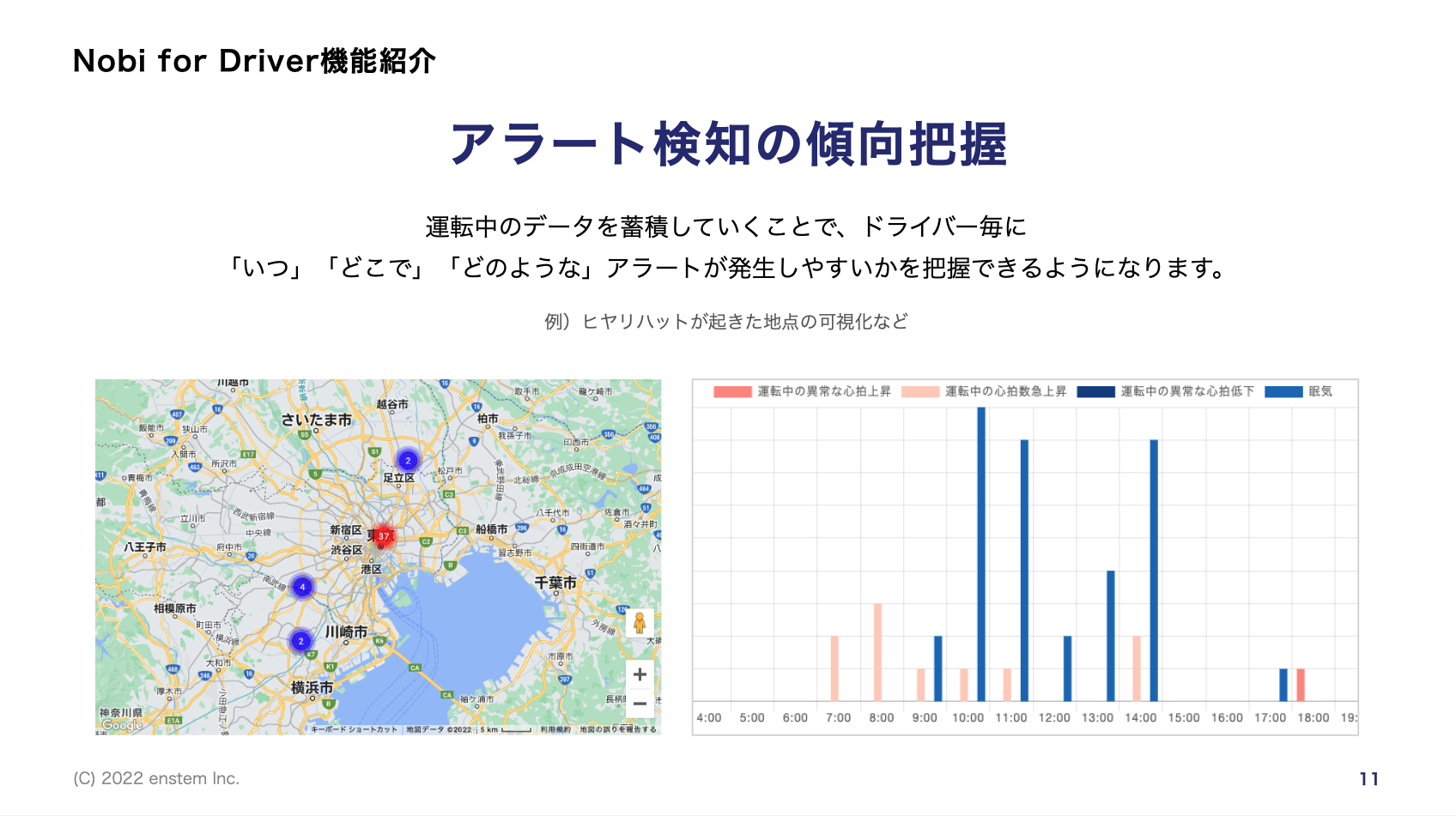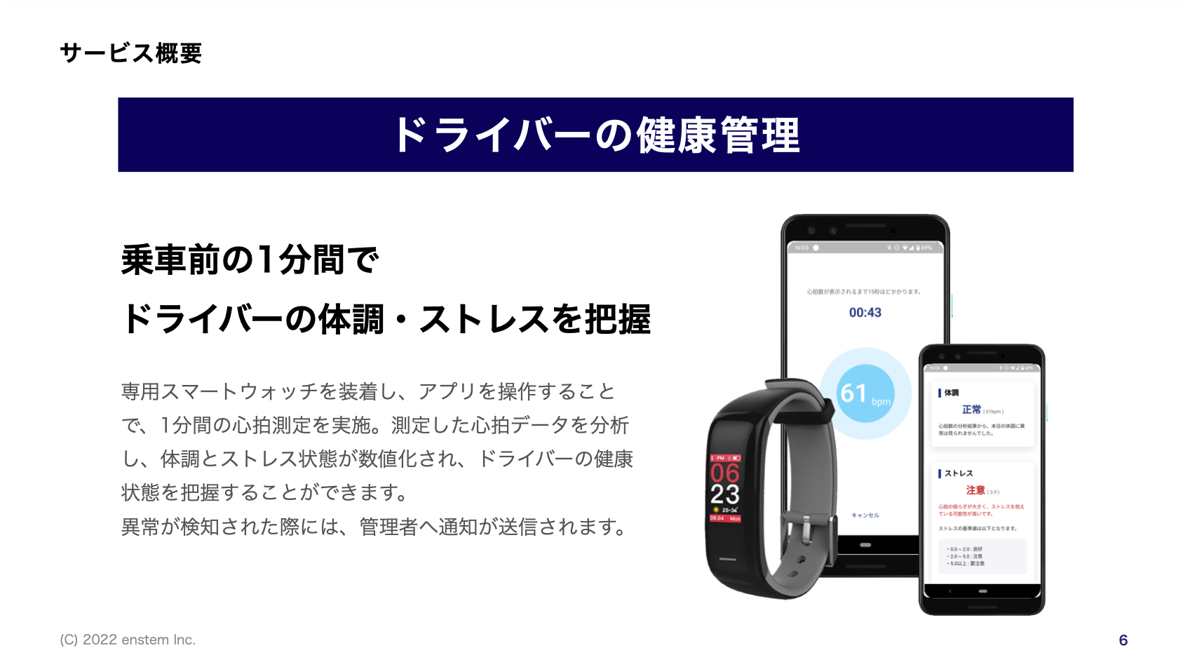 株式会社enstem(東京都中央区 / 代表取締役 : 山本寛大 / 以下enstem)は2022年06月に生体データを活用したドライバーの安全と健康の管理を実現する「Nobi for Driver( https://nobi-app.com/driver )」を正式リリースしたことをお知らせします。