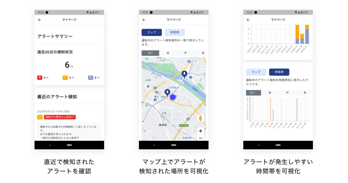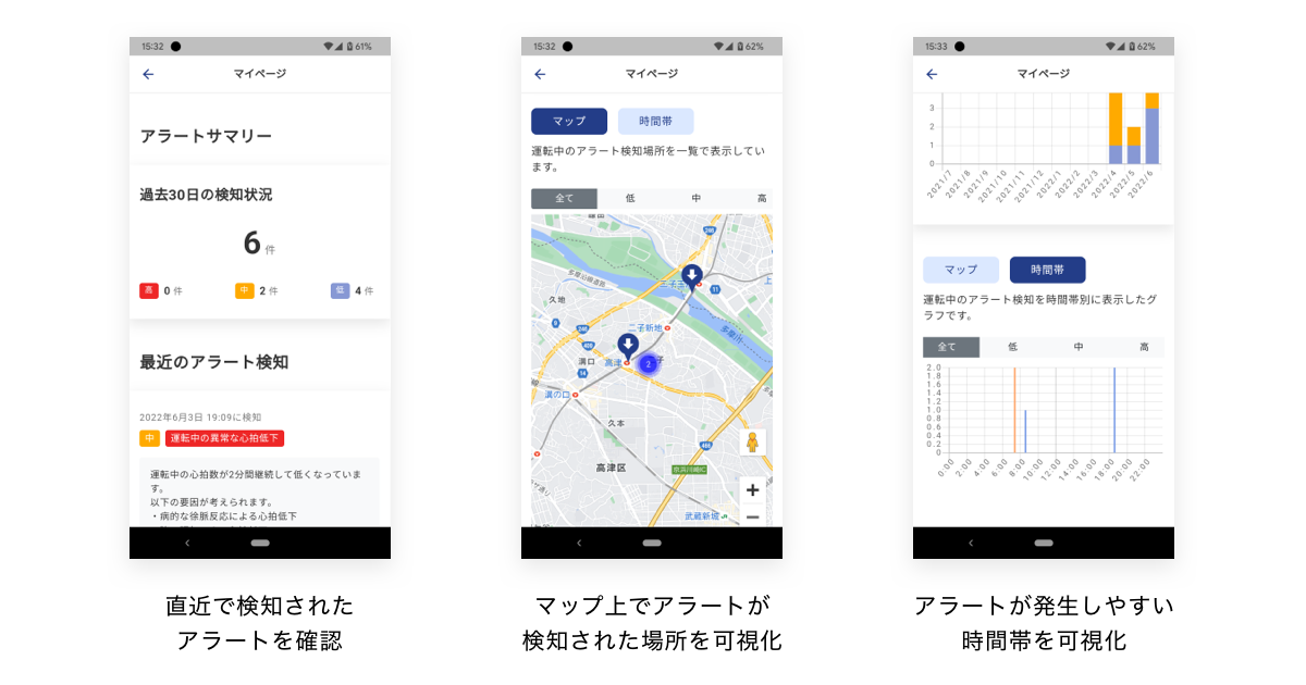 上記の「運転中」および「1分間チェック」で計測したデータを分析し、ドライバーに発生している異常の可能性を高・中・低の3段階で検知します。データが蓄積されることで、アラートの基準値が個人に最適化されていき、アラート検知の精度の向上に繋がります。また、蓄積されたデータをもとに、ドライバーのアラート検知の傾向を知ることも可能です。