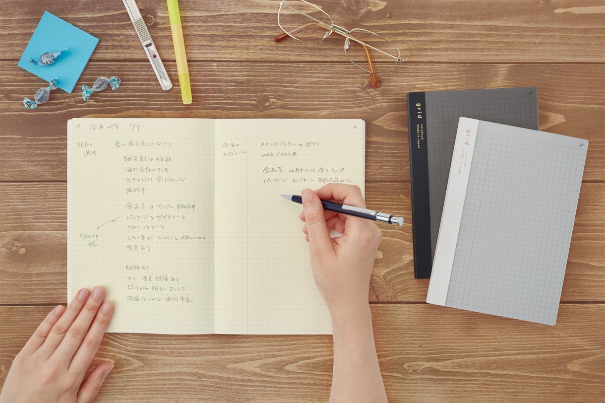 一見すると普通の方眼ノートだが、よく見ると方眼の左側に太く強調された一本の垂直線が入っている。さりげない一本の線は、タイトルを書き込むのに程よいバランスになっており、ノートの編集性を高めている。