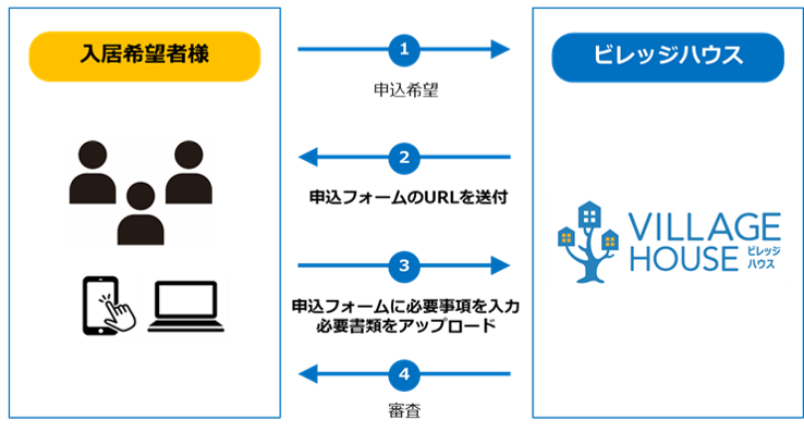 ビレッジハウス・マネジメント株式会社(本社:東京都港区、最高経営責任者:岩元 龍彦、以下ビレッジハウス)は、2022年6月20日から個人の入居希望者を対象に、仲介会社を通さないビレッジハウスとの直接取引における申込から契約までの完全電子化を開始しました。2021年1月から開始した直接取引における賃貸借契約の電子化(以下、電子契約)に続いて電子申込を導入し、今後は電子申込でも英語、ベトナム語、ポルトガル語などの多言語対応を目指してまいります。