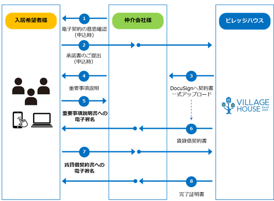 2022年5月に施行された改正宅地建物取引業法により、重要事項説明書及び賃貸借契約書への押印が不要となり、電子書面での交付が可能となったため、仲介会社経由の取引においても電子契約が可能となりました。ビレッジハウスは、2021年1月に電子署名ソリューション「DocuSign(ドキュサイン)」を導入し、直接取引における賃貸借契約(定期借家契約を除く)を電子化しており、この仕組みを個人の入居希望者を対象とした仲介会社経由の契約にも拡大しました。