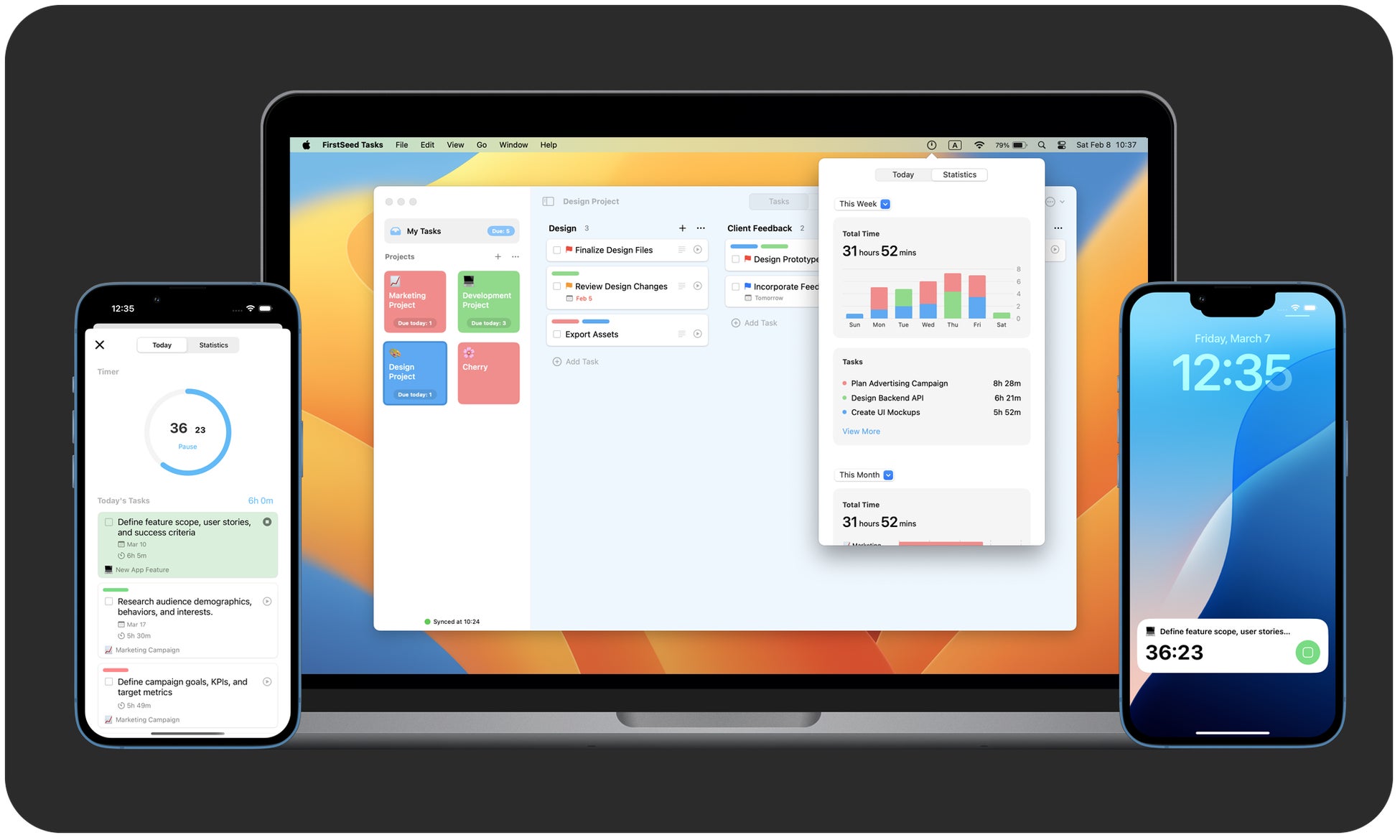 FirstSeed Tasksはタスクをボード画面やタイムライン上で作成し、ドラッグ&ドロップ操作で視覚的に使えるタスク管理アプリです。従来のタスク管理アプリではタスクの「整理や計画」が中心でしたが、FirstSeed Tasksの最新版ではタスクの「実行」そして「完了」までを支援するためのタイマー機能を新たに搭載しました。これにより生産性を最大限に向上させる事ができます。