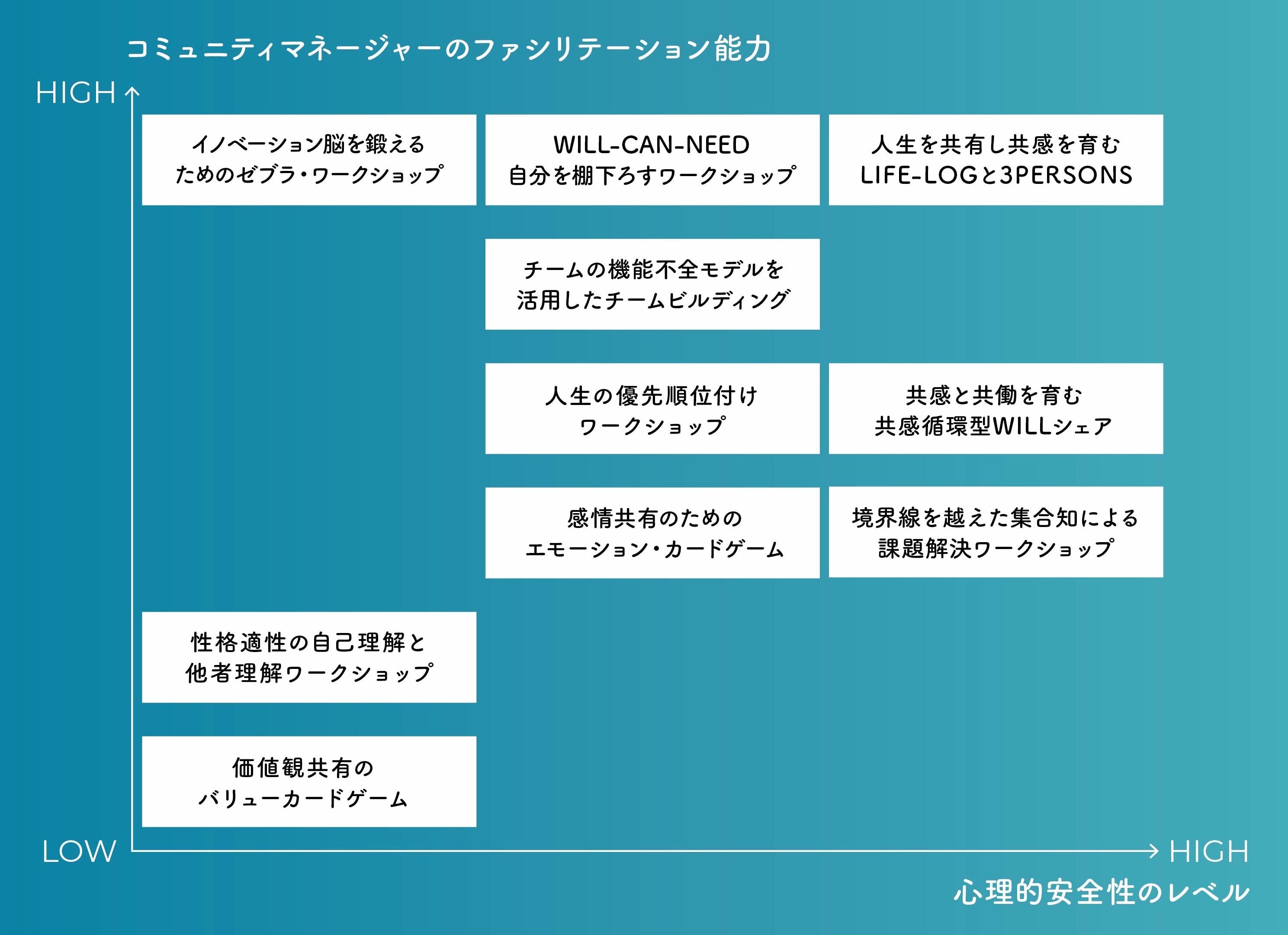 ファイアープレイスは、人と人のつながりをデザインする「コミュニティデザイン」領域のプロフェッショナルです。年齢・役職・職域などに拠らず、タテ・ヨコ・ナナメのコミュニケーションを活性化し、フラットな人間関係を育むためのコンテンツを、「感情の共有」「価値観の共有」「想いの共有」以上3つのカテゴリーで開発いたしました。一つひとつのコンテンツの所要時間は30分〜90分程度。短い時間で、驚くほどの効果が期待できます。