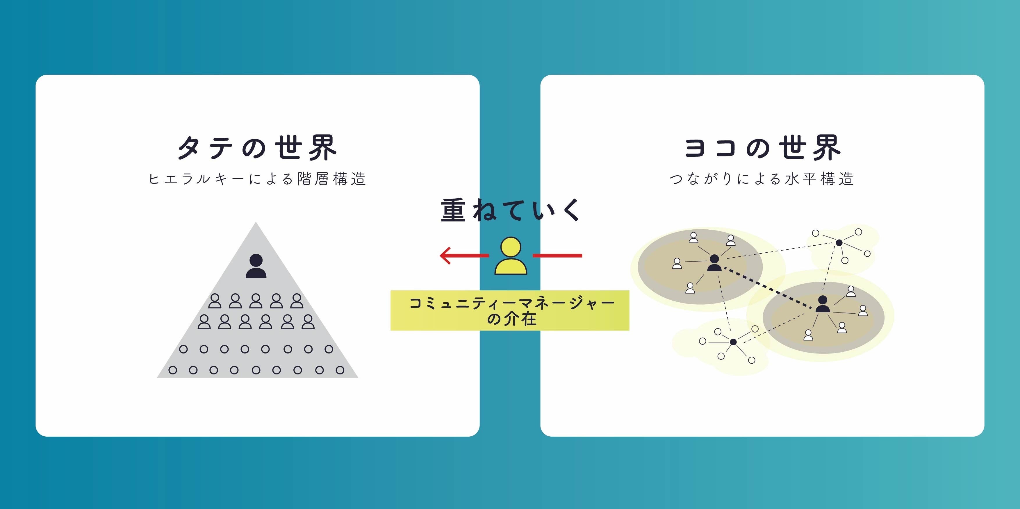 「タテ」か「ヨコ」かではなく、「タテ」に「ヨコ」を重ね合わせていく。この、ヨコを重ね合わせていく役割を担うのが、コミュニティマネージャーと呼ばれる人材です。