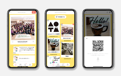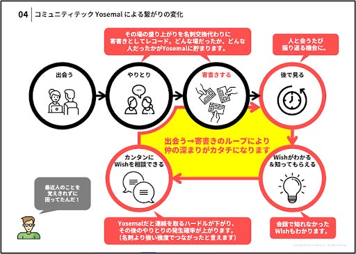 そこで、出会う人の数が増え続ける現代社会において、その限界を超えるためのappをコワーキング企業であるアトミカ社(ディー・サインのグループ会社)が開発致しました。ユーザーが新たな人と出会うたび、名刺交換に代わりグループで記憶に残る形でレコードできるapp、Yosemalです。その他、相談事を気軽にWISHとして共有でき、関係の積み重ねをappに蓄積できるようにデザインされており、コミュニティ内での助け合いが自動で発生しやすくなります。テクノロジーの力でプライバシーを保護しながらも、人と人のつながり=SOCIAL KNOTの量や度合いが可視化することで、コミュニティの起ち上がりと改善を支援します。