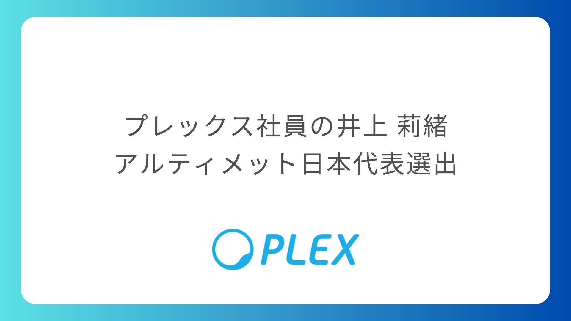 株式会社プレックス(所在地:東京都中央区、代表取締役社長:黒﨑 俊、以下当社)は、当社社員の井上 莉緒がアルティメットの日本代表に選ばれたことをお知らせいたします。