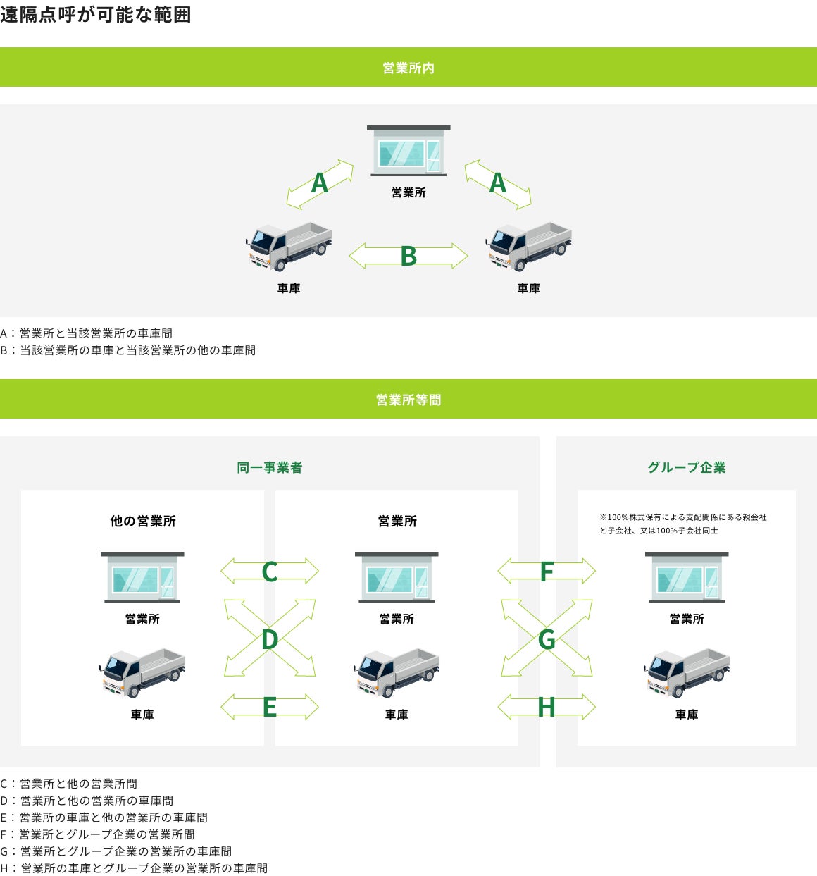 従来認められていなかったグループ企業間での点呼やタクシー・貸切バス事業者様営業所間、車庫間での点呼が可能になります。