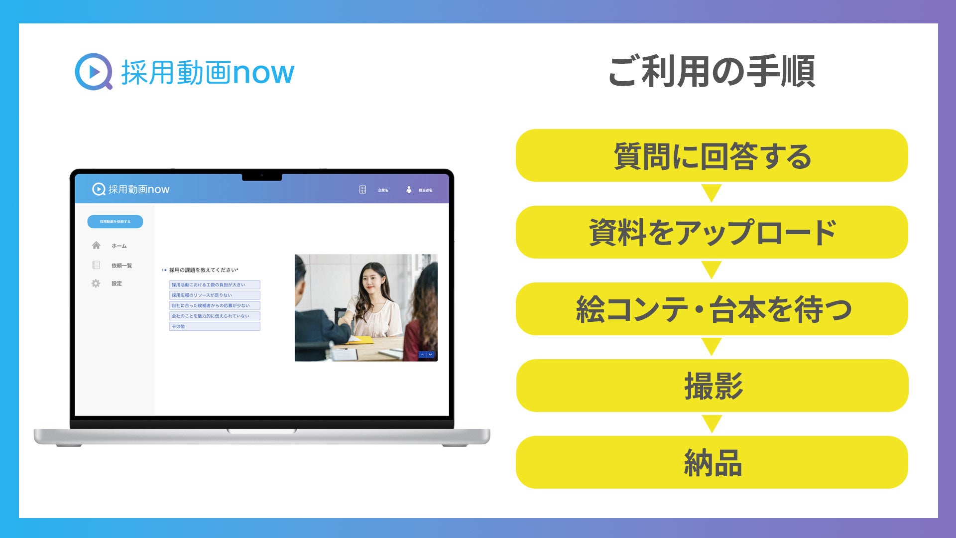 制作可能な動画は社長インタビュー動画、事業プロダクト紹介動画、社員インタビュー動画、オフィスツアー動画、採用イベント動画、SNS用ショート動画etc...