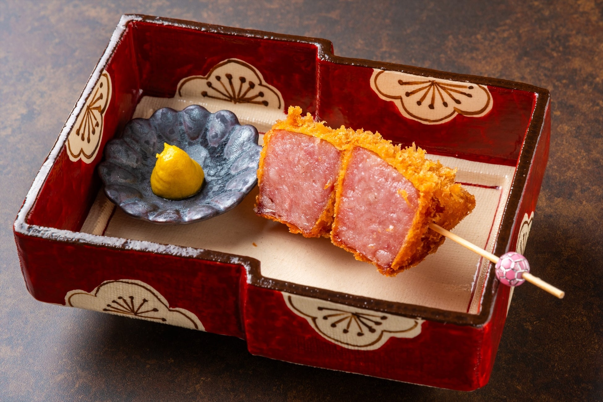 トロ肉(頭肉)を天然塩で熟成させた 雲仙ハムを使用した肉の旨みをダイレクト に感じられるハムカツです。