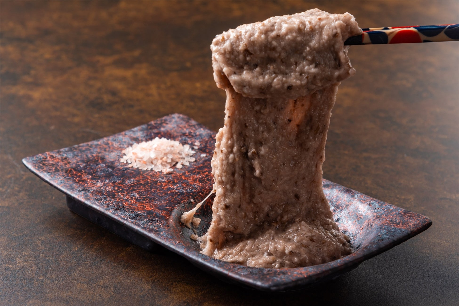 「博多和牛もつ鍋おでん」は、臭みがなく甘みのあるモツを使用し、優しい味わいの出汁とバランスがとれた、お酒との相性も抜群のおでんです。様々な種類のおでんを召し上がって頂きたいという思いから、おつまみサイズで提供しています。また、免疫力向上や滋養強壮、便通改善などが期待できると注目されている日本古来のスーパーフード・自然薯も店名に冠したこだわりの一つです。全国の自然薯から選び抜いた熊本県阿蘇産の自然薯は、注文を受けてから皮ごと擦りおろした生とろろをそのまま召し上がって頂きます。風味豊かでコク深い味わいと、粘り気が強く、まるでお餅を食べているかのような食感が楽しめます。