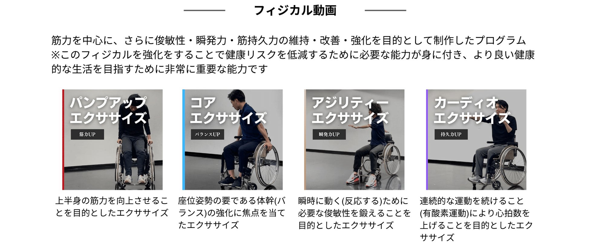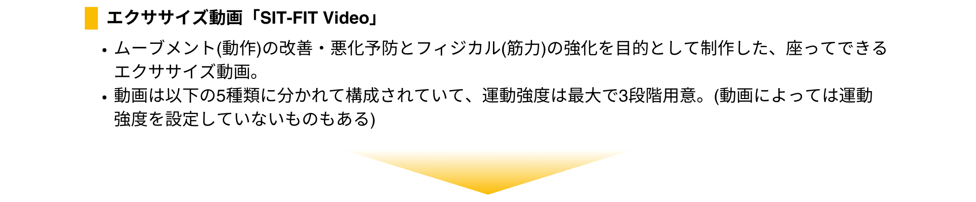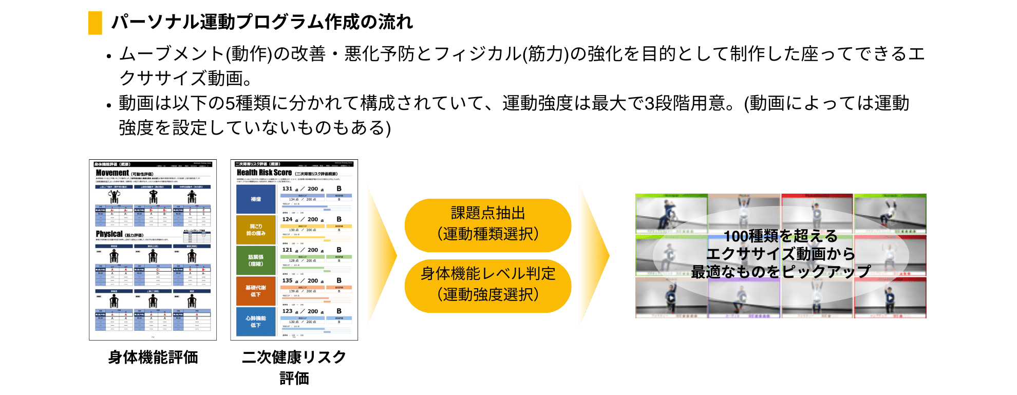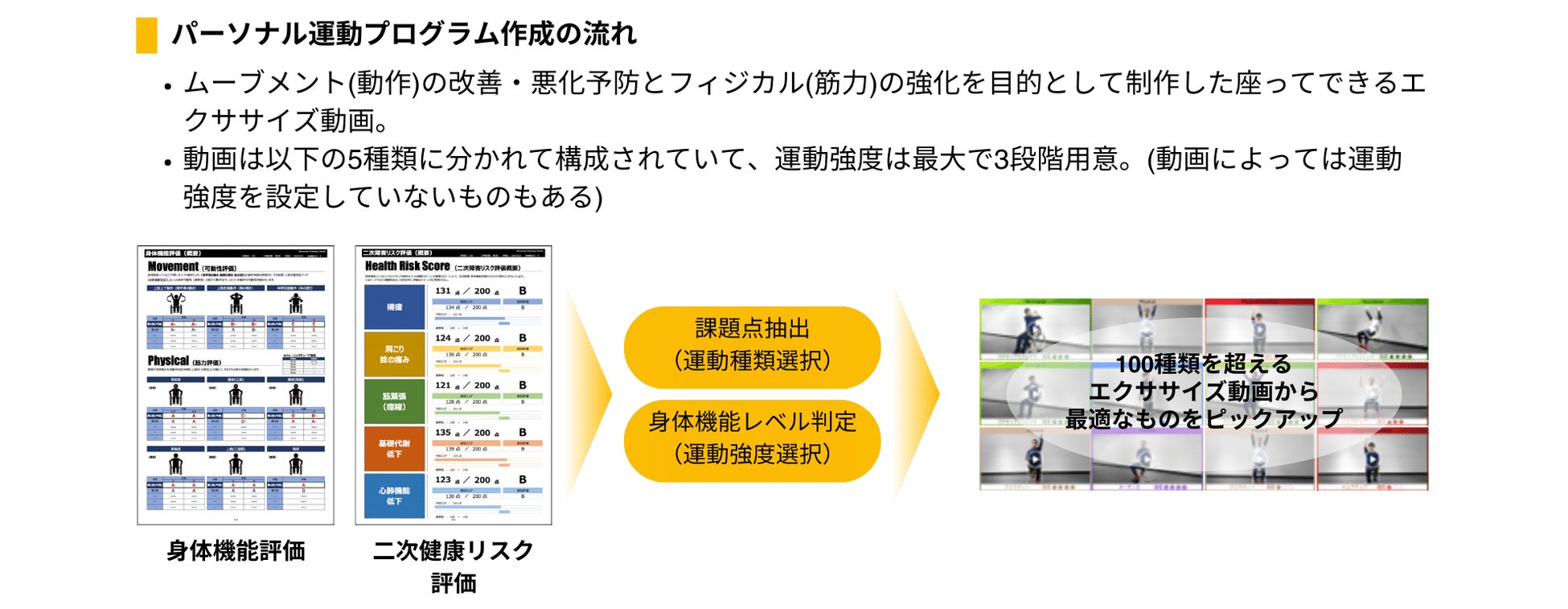 ・評価結果に基づき、”強み“の伸長と”弱み“の改善を目的に100種類を超える座ってできるエクササイズ動画「SIT-FIT Video」の中から、課題に応じて最適な動画をピックアップしたパーソナライズされた運動プログラムを作成(1ヶ月分10動画を毎月更新)