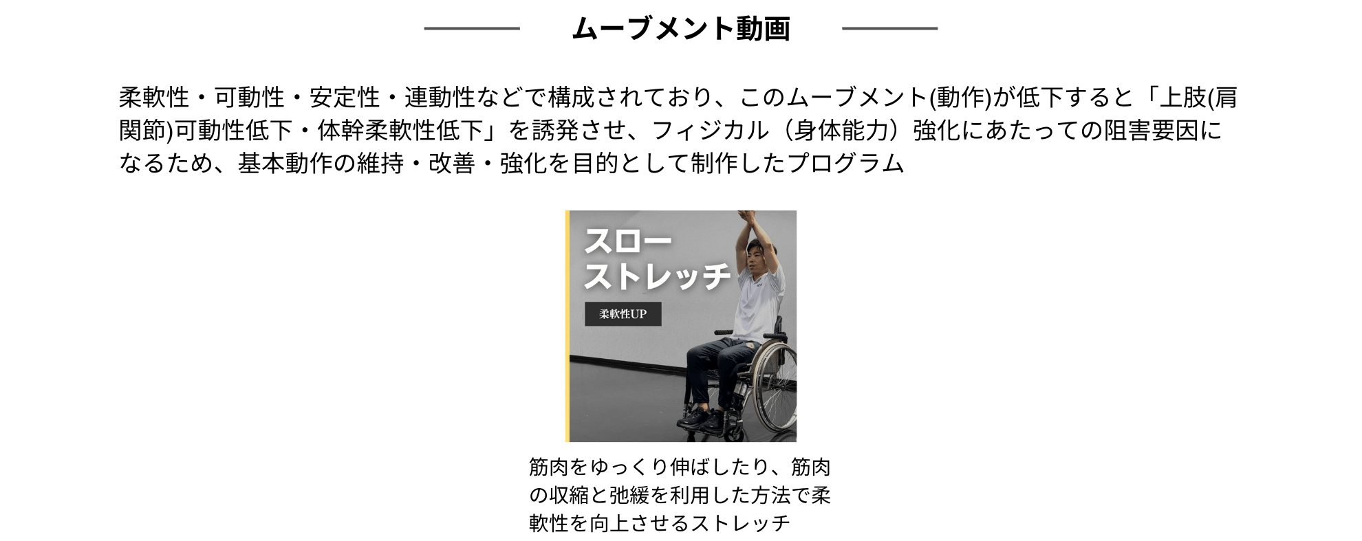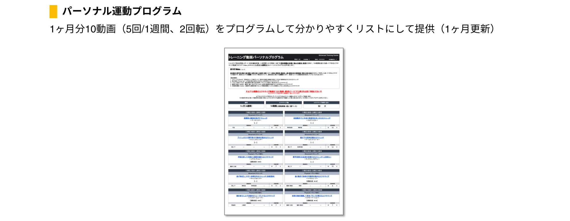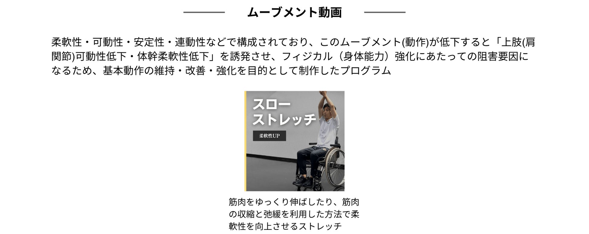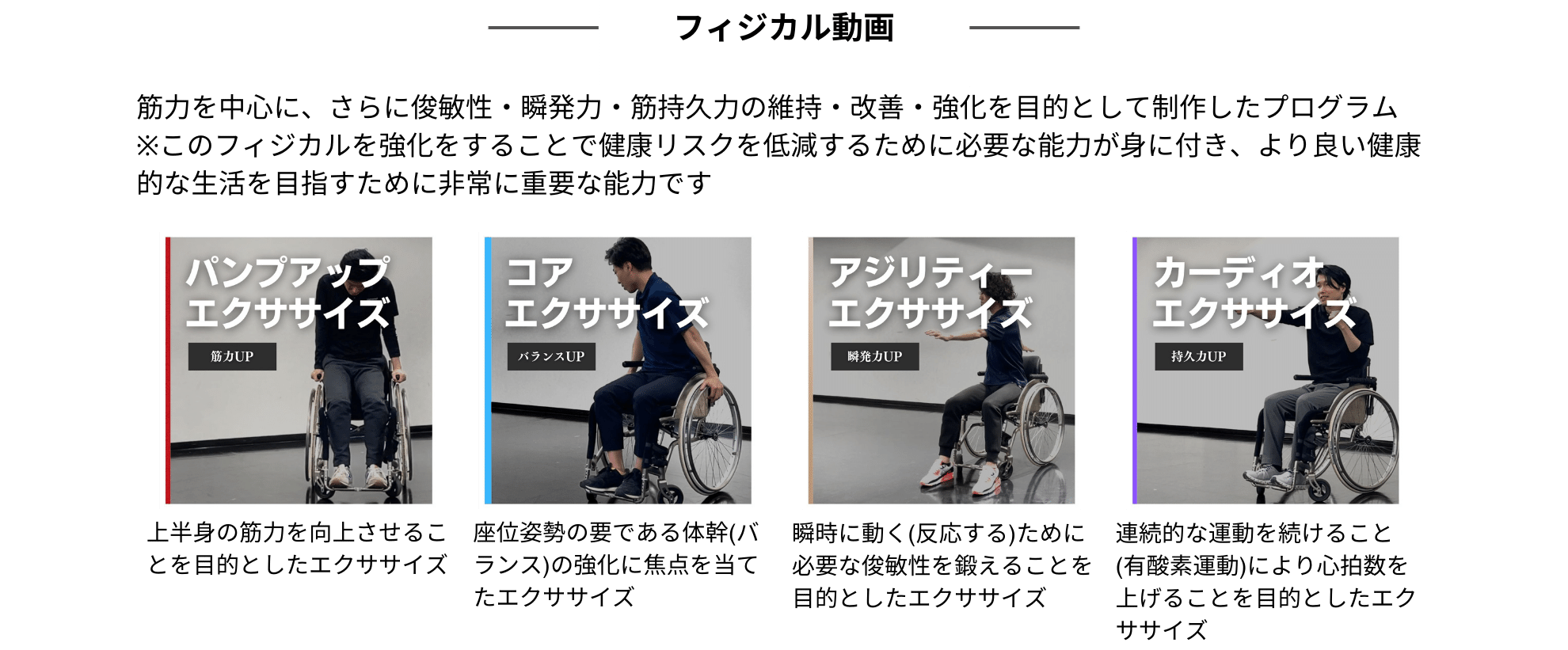 ・評価結果に基づき、”強み“の伸長と”弱み“の改善を目的に100種類を超える座ってできるエクササイズ動画「SIT-FIT Video」の中から、課題に応じて最適な動画をピックアップしたパーソナライズされた運動プログラムを作成(1ヶ月分10動画を毎月更新)