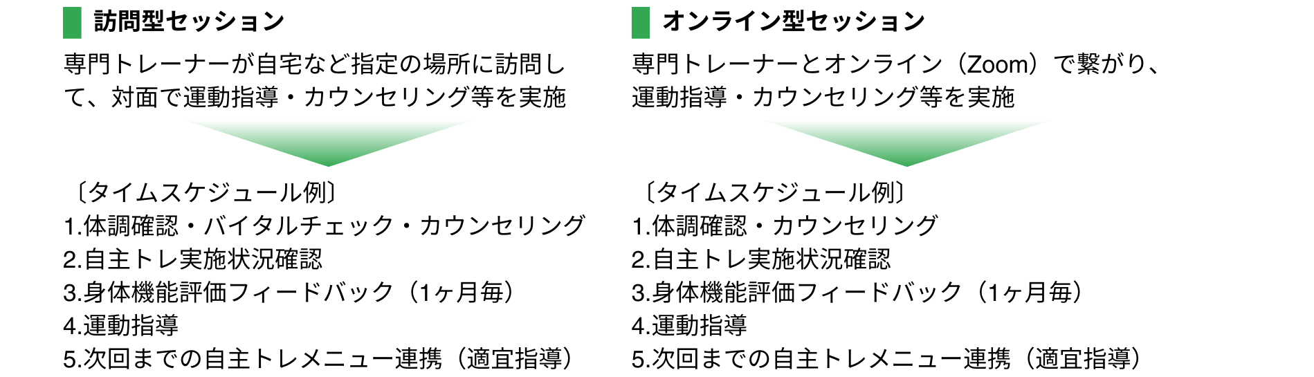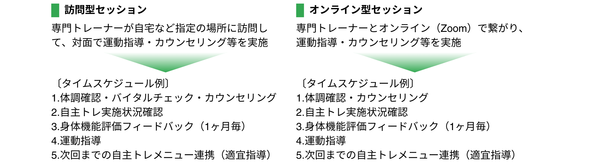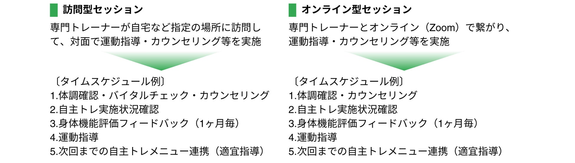 毎日の自主トレ(パーソナル運動プログラム)実施状況や身体機能の変化、コンディションなどを訪問またはオンラインでの“対面的なセッション”で定期的に状況確認すると共に個別指導を実施