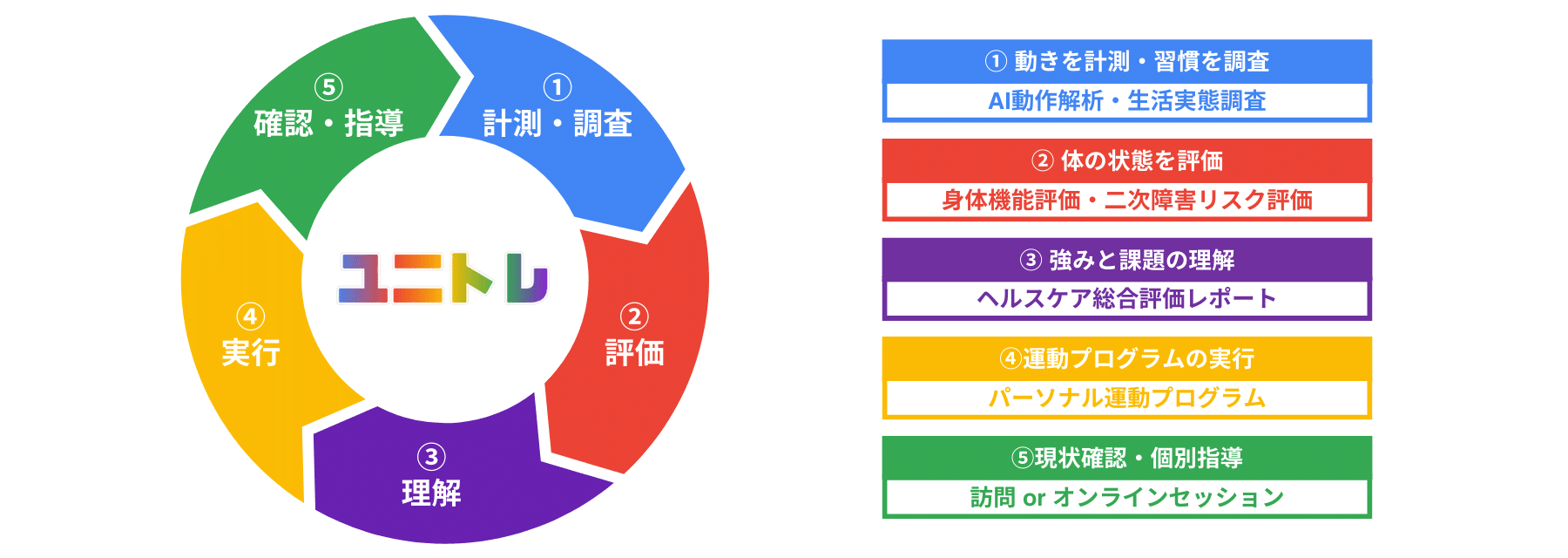 訪問またはオンラインで専門トレーナーによる個別指導をベースに、AI動作解析と生活習慣調査を基に課題(目標感)を特定し、課題に応じてパーソナライズされた運動プログラムの作成、自主トレメニューの提供など、運動習慣化に寄与する“トータルヘルスケアサービス”