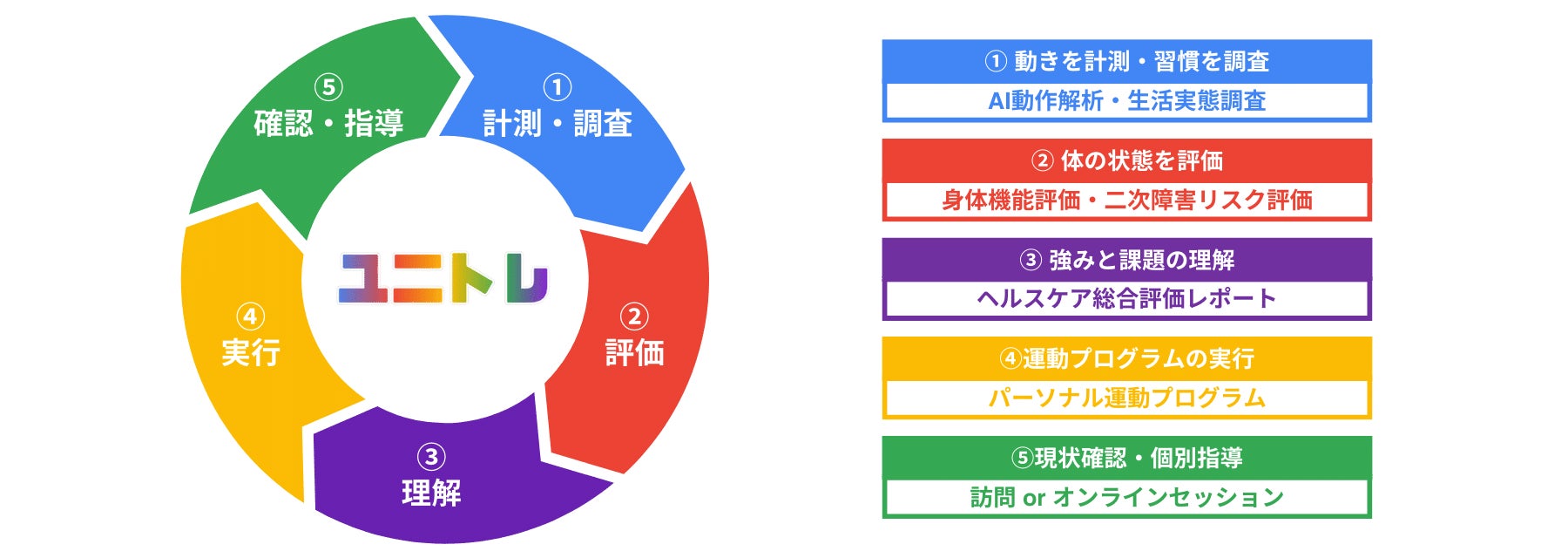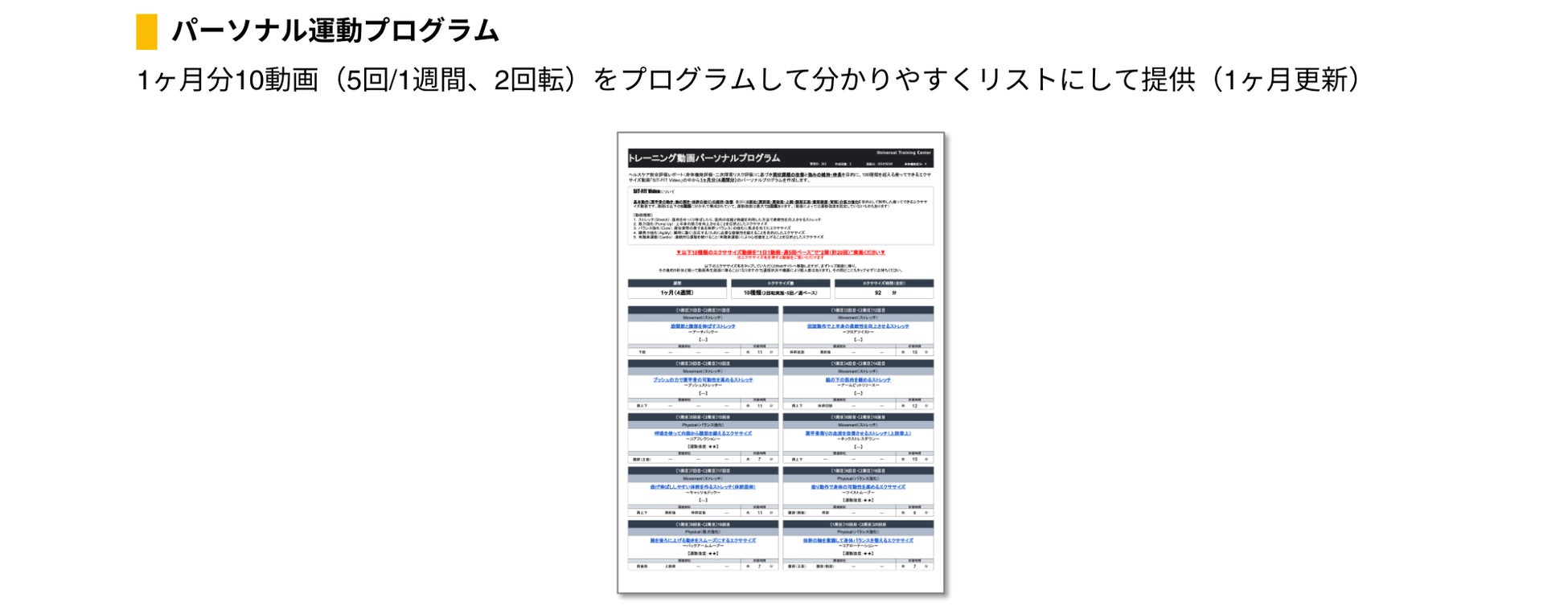 AI動作解析と生活習慣調査を基に課題(目標感)を特定し、パーソナライズされた運動プログラムの作成、自主トレメニューの提供など運動習慣化に寄与する“トータルヘルスケアサービス”ユニトレPERSONAL