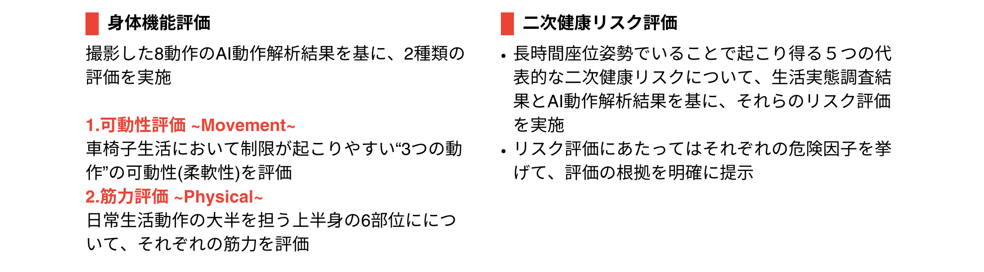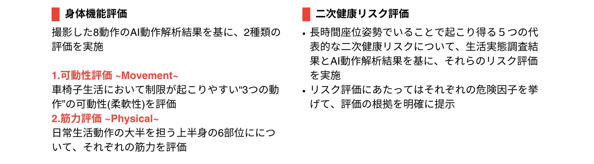 AI動作解析及び生活実態調査結果と独自開発した評価アルゴリズムから「身体機能評価」と「二次健康リスク評価 *」を実施(*二次健康リスク:原因疾患・怪我によって併発する症状の発生リスク)