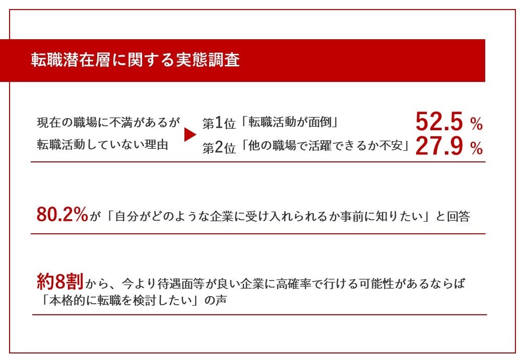 まず、約8割が、現在の職場に不満を持ち始めてから今に至るまでに「転職を検討したことがある」と回答しており、その理由については、「転職活動が面倒だから」(52.5%)「自分が他の職場で活躍できるか不安だから」(27.9%)が上位になりました。また、転職を検討する際に「自分がどのような企業に受け入れられるか事前に知りたい」という人は80.2%にのぼり、その理由として、55.8%が「効率的に転職活動ができるから」と回答しています。さらに、約8割から、「今より待遇面等が良い企業に高確率で行ける可能性があるなら、本格的に転職を検討したい」の声が聞かれました。