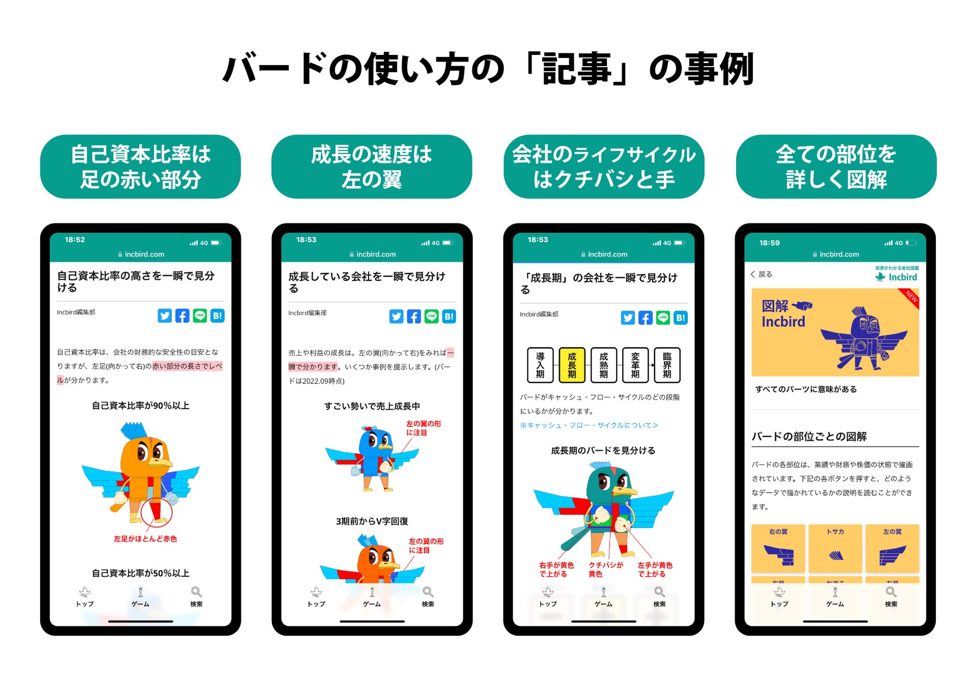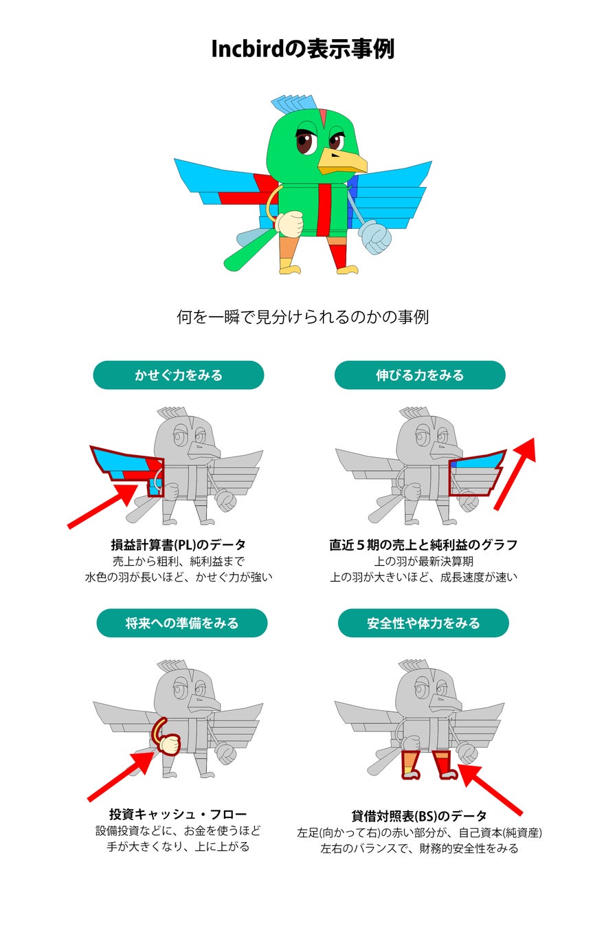 会社図鑑Incbirdでは、これまで利用されてきたさまざまな投資情報と異なり、会社の経営状態がひと目でわかるようにビジュアル化したのが大きな特徴です。