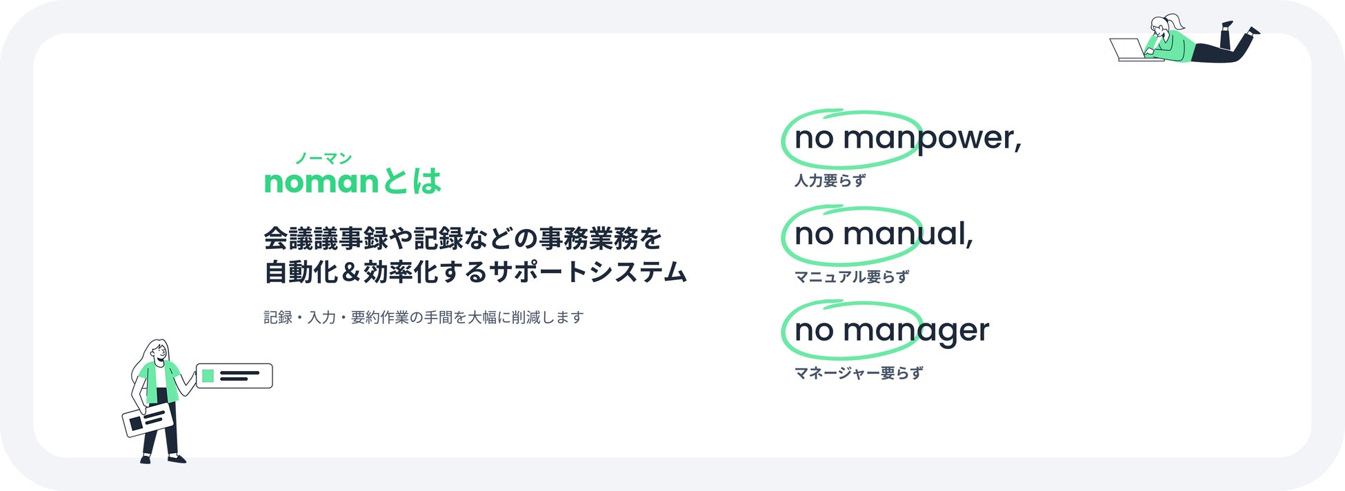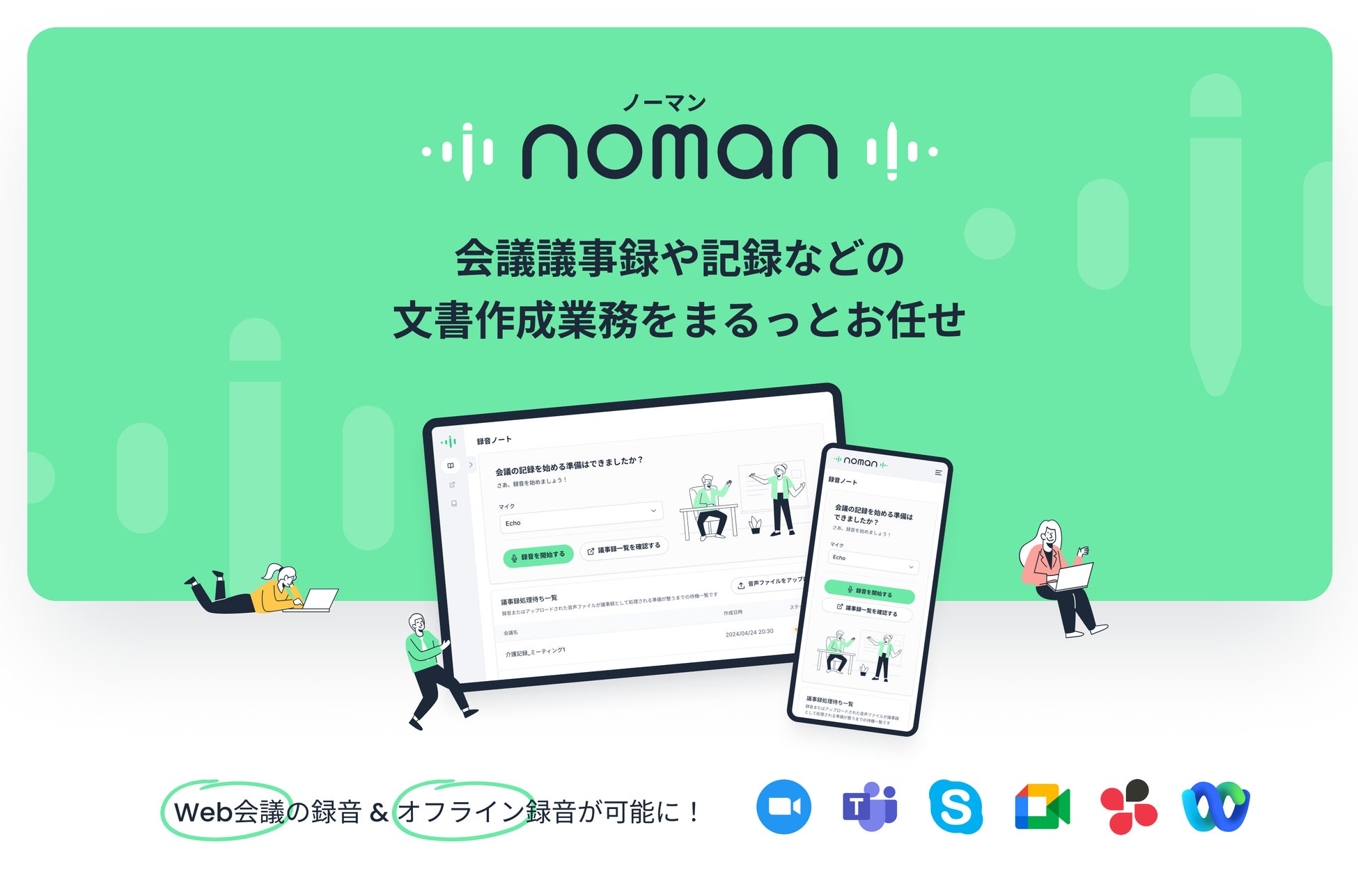 「noman(ノーマン)」は最先端の生成AIを活用し、介護現場での議事録・記録等の文書作成業務を自動化することで業務効率を大幅に向上させるアプリケーションです。
