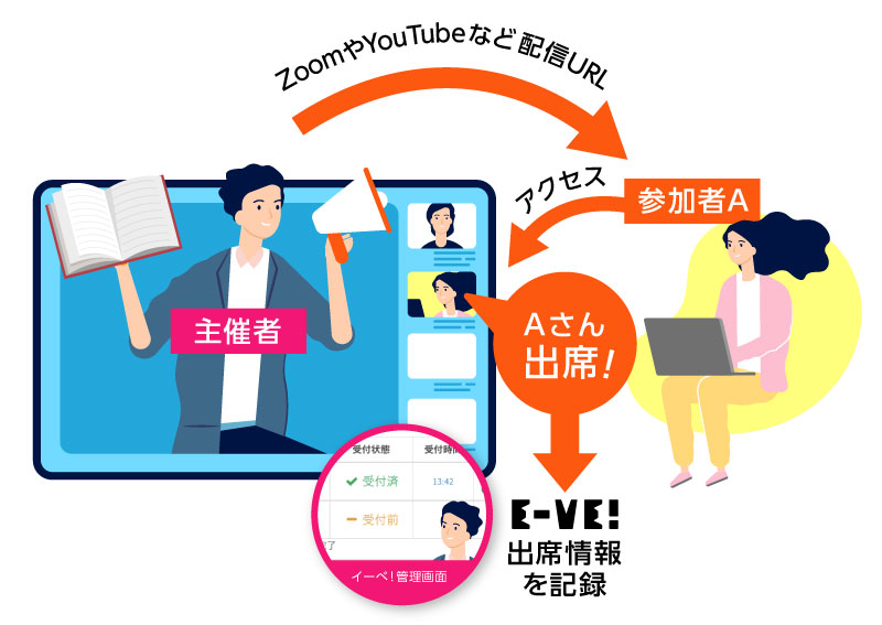 参加者へ配信情報URLをイーべ!を介して送信していただくと、参加者がそれをクリックしたタイミングでイーべ!内参加者リスト上で「出席」となり、「クリックした時刻」も同時に記録します。
