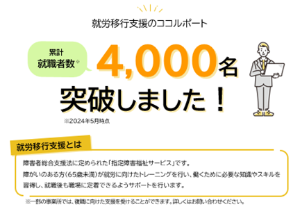 障がい者就労移行支援事業を展開するココルポートが、2024年5月、累計就職者数4,000名を突破