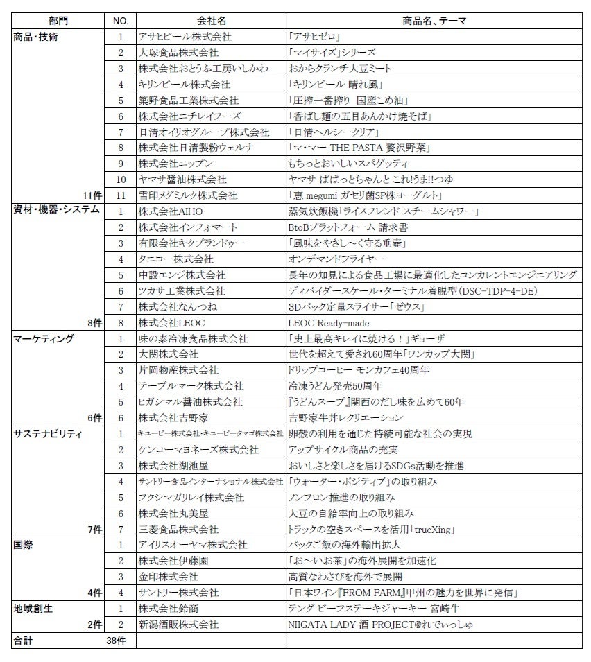 今回は、独自技術を背景にしたヒット商品やサービスなど、6部門38件の商品及びテーマが受賞しました。部門別の内訳は、商品・技術部門が11件、資材・機器・システム部門が8件、マーケティング部門が6件、サステナビリティ部門が7件、国際部門が4件、地域創生部門が2件です。