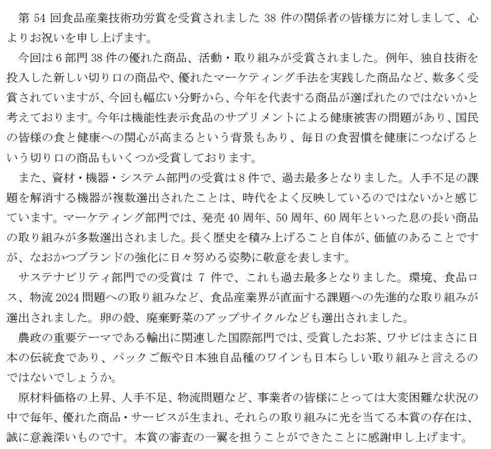 「第54回食品産業技術功労賞」6部門・38件が受賞