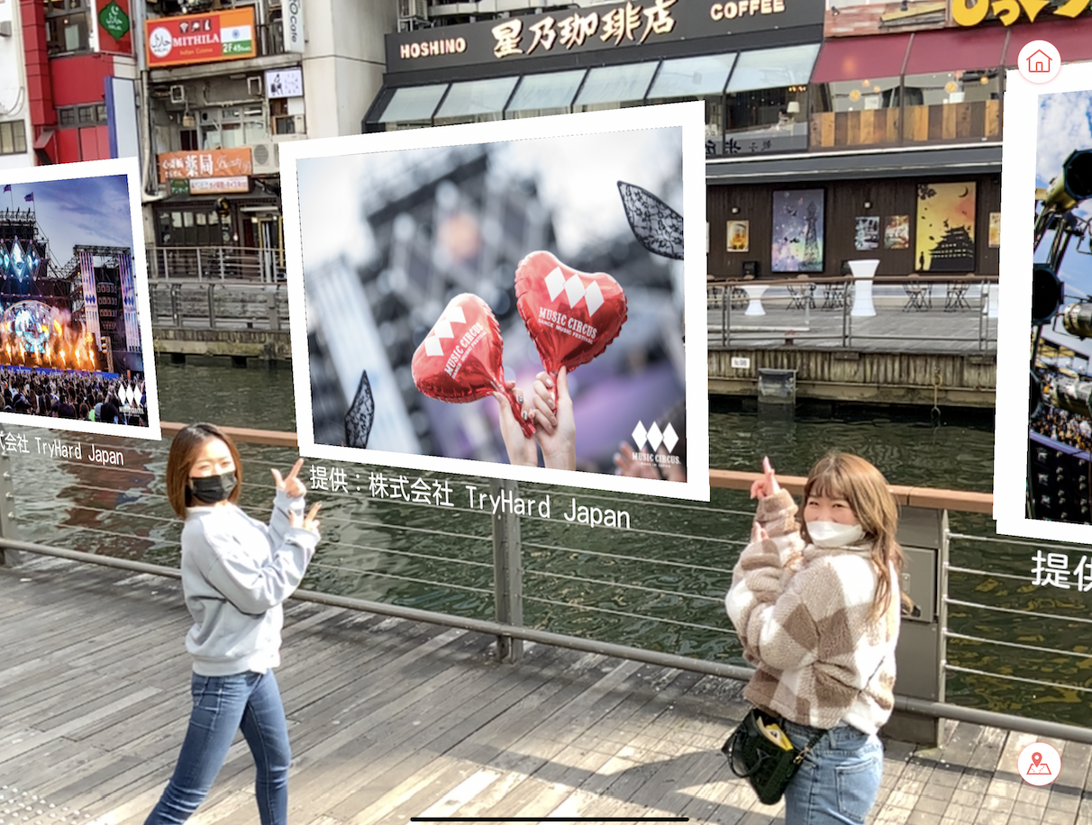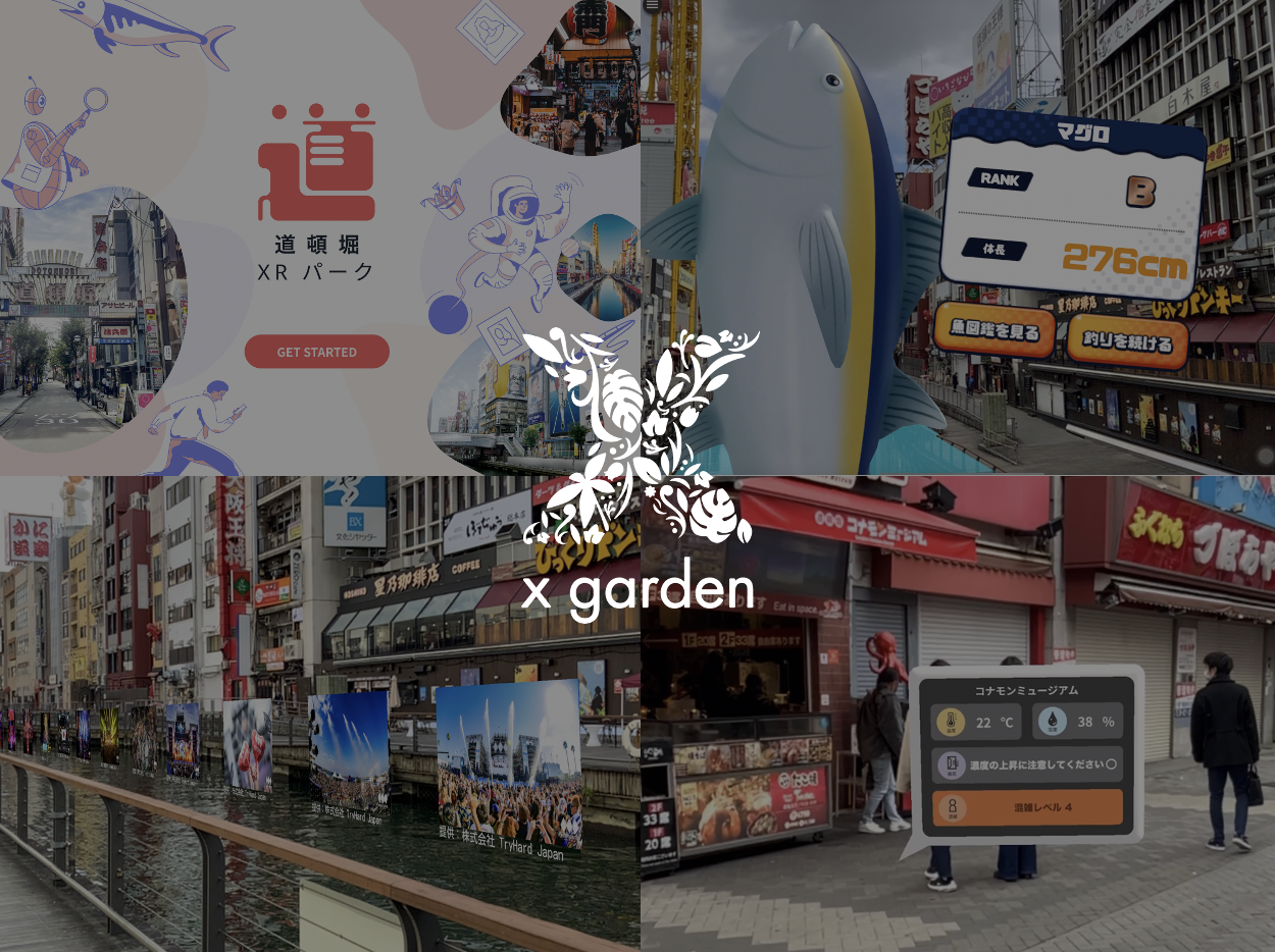 株式会社x gardenは、株式会社NTTドコモ、道頓堀ナイトカルチャー創造協議会(※1)、株式会社JTBが提供する観光DX実証実験「道頓堀XRパーク」におけるARコンテンツの体験設計とアプリケーション開発の協力を行いました。