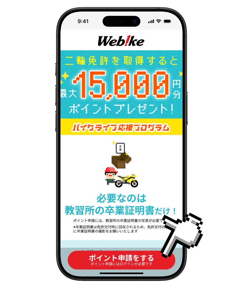 これまではウェビックの利用、またはバイクを購入したライダーにウェビックポイントを最大15,000円分進呈していましたが、新たなライダー応援サービスとして指定自動車教習所を卒業し、卒業証明書をお持ちの方を対象に、Webikeで使える最大15,000円分のポイントを進呈します。