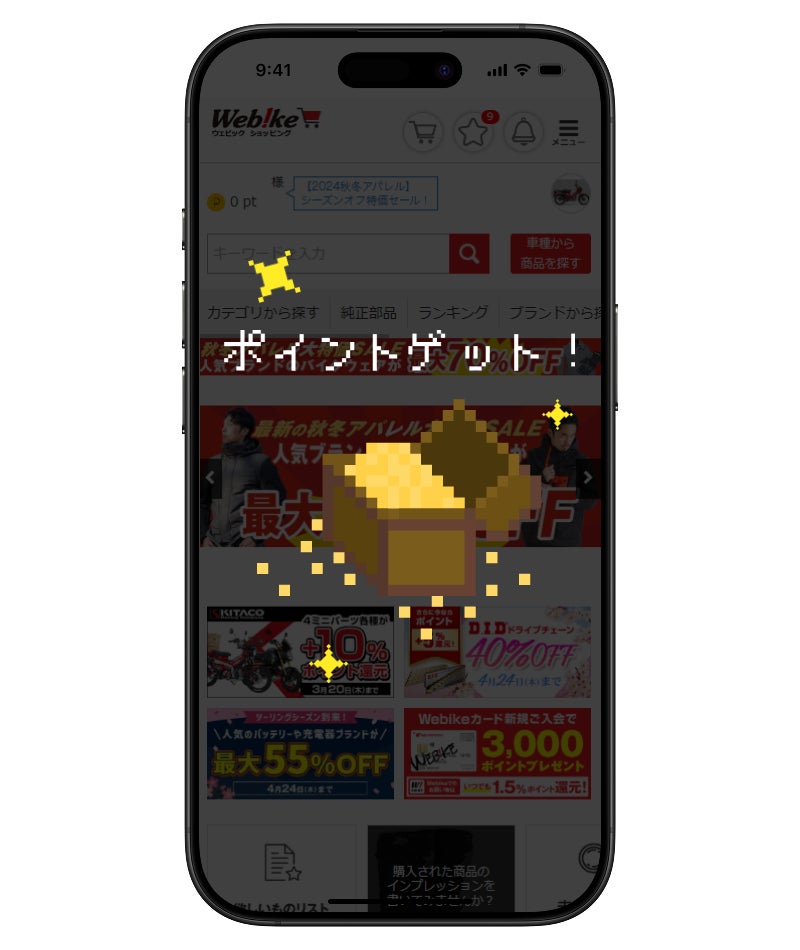 ウェビックでご利用いただけるウェビックポイントをプレゼントすることで、新たなバイクライフをサポートするプログラムです。