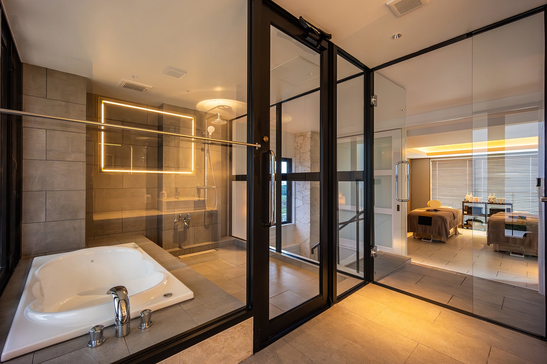 2024年7月にオープンした〈AQUA AREA〉は、1階フロアに温水プール・ドライサウナ・フィットネスジムなどのスパエリア、2〜3階フロアにエステ(Beauty & Spa chaleur+ Okinawa)を併設しております。南国感あふれる大人のリゾート空間で、癒しとくつろぎの時間を心ゆくまでご堪能いただけます。