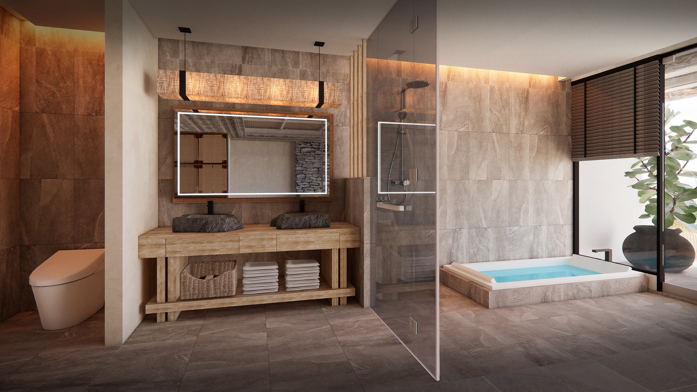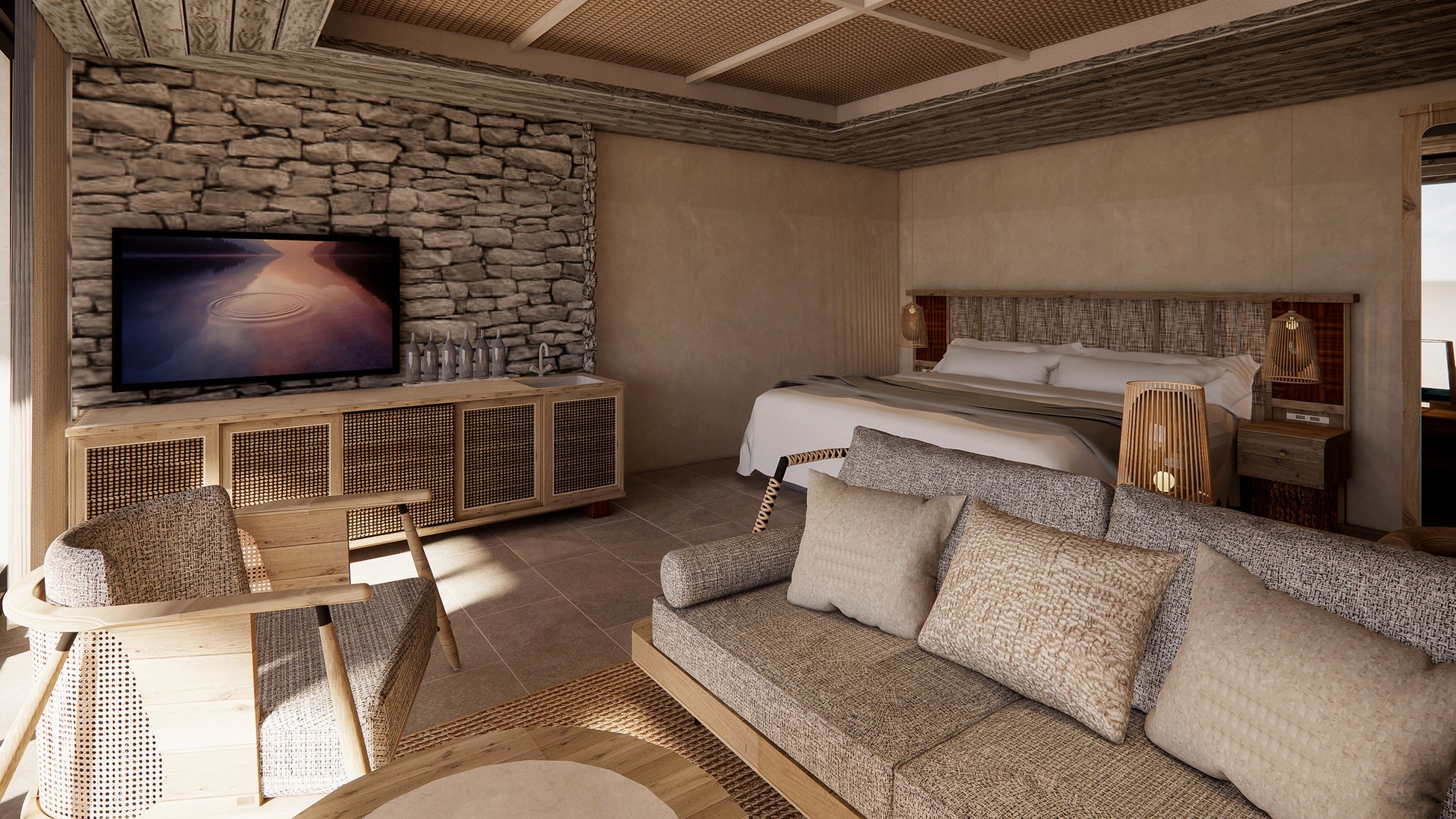 「プールヴィラスイート」の各客室には専用のプライベートプールとサウナを完備し、滞在そのものが整う時間へと昇華。広々としたリビングスペースと、木目調を基調とした落ち着きある内装が、自然と調和した上質な寛ぎを演出します。