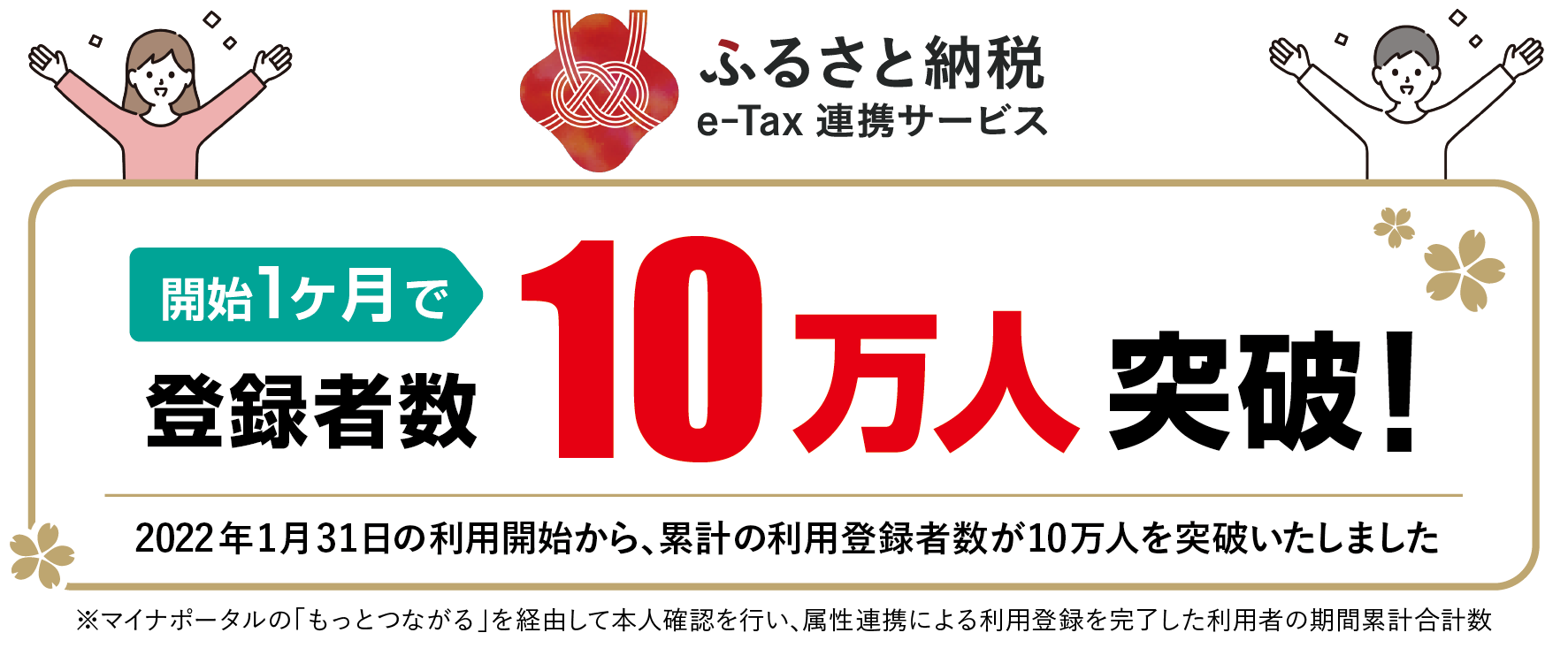 シフトセブン 「ふるさと納税e-Tax連携サービス」が開設からわずか1ヶ月で利用登録者数が10万人を突破しました。