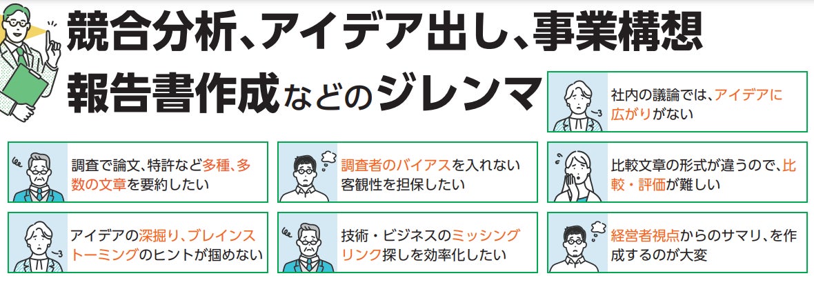 GPTなどの先端技術で、「R&D・事業企画の調査分析」のお困りを解決! さらに「深掘りした良く練られたアイデア・提案」に繋ぎます!