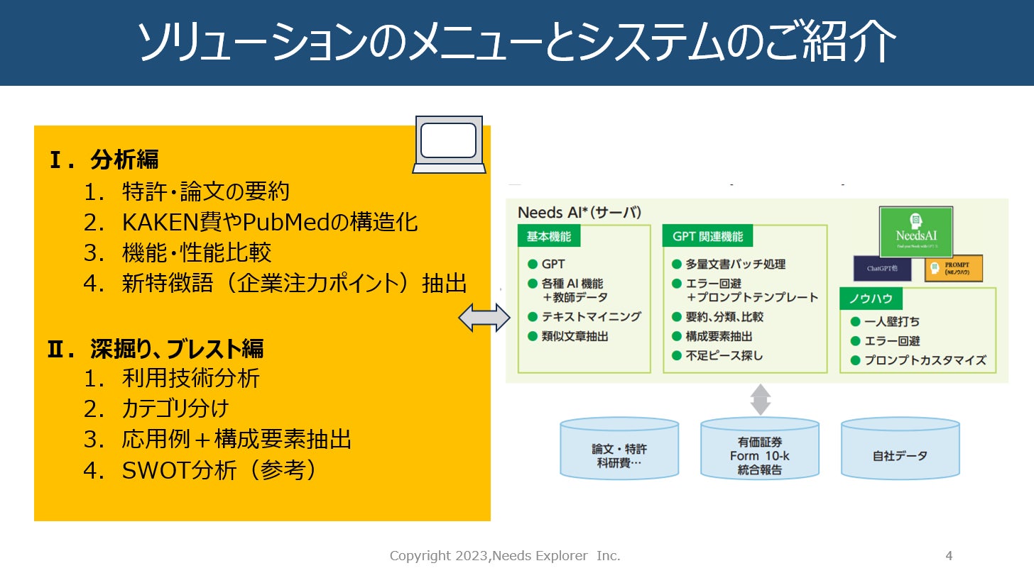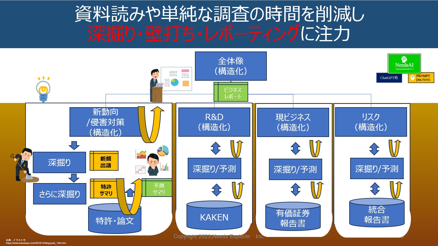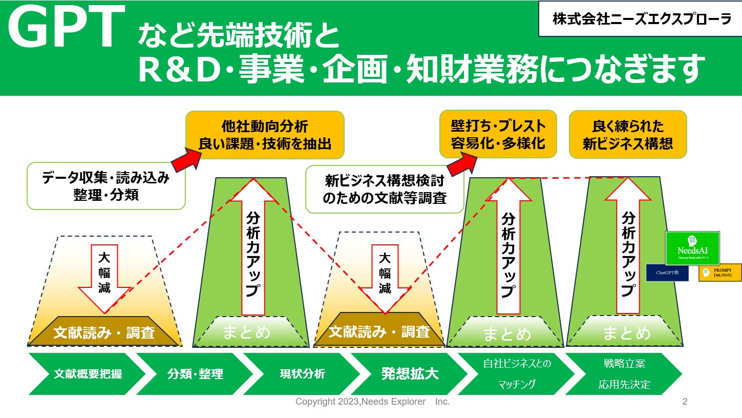 ニーズエクスプローラ社は、GPTなどの先端技術で、貴社業務(R&D、事業部、企画・知財他)のお困り事を解決し、さら深掘りした良く練られたアイデア・提案への応用をする事をご支援するエキスパートです。
